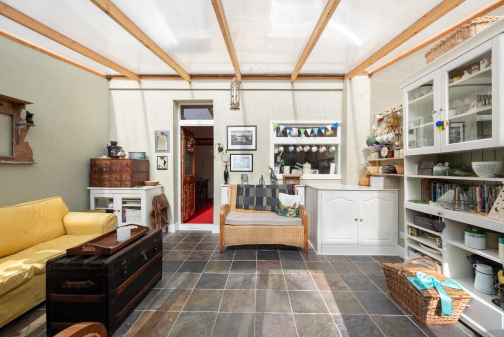Based on the provided images, the property appears to be in generally good condition. While the interior decor is dated and eclectic, there is no obvious evidence of significant structural damage or the need for extensive renovations. The property includes a conservatory extension and a well-maintained garden, adding to its appeal.