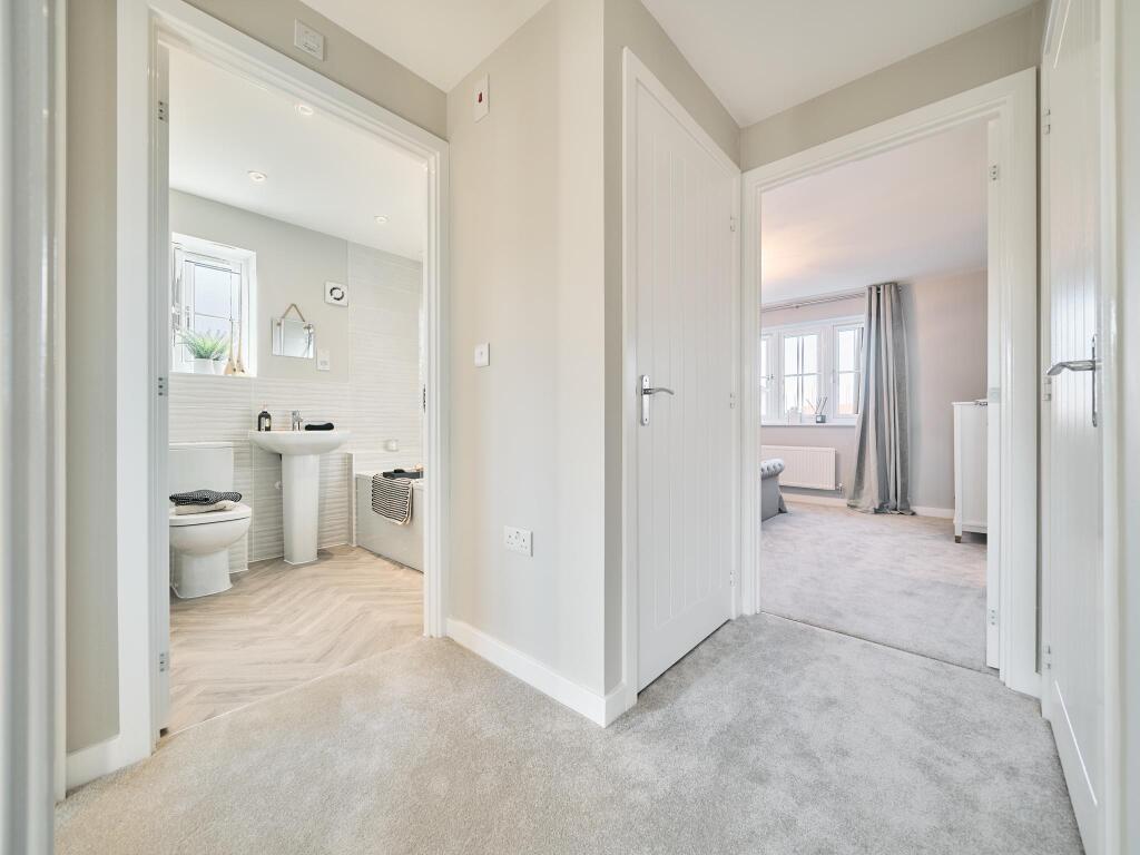 The three-bedroom Stretton has an open plan kitchen/dining room with French doors to the garden and a spacious front-aspect living room with a bay window. Upstairs there are three bedrooms - bedroom one has an en suite - and a family bathroom.