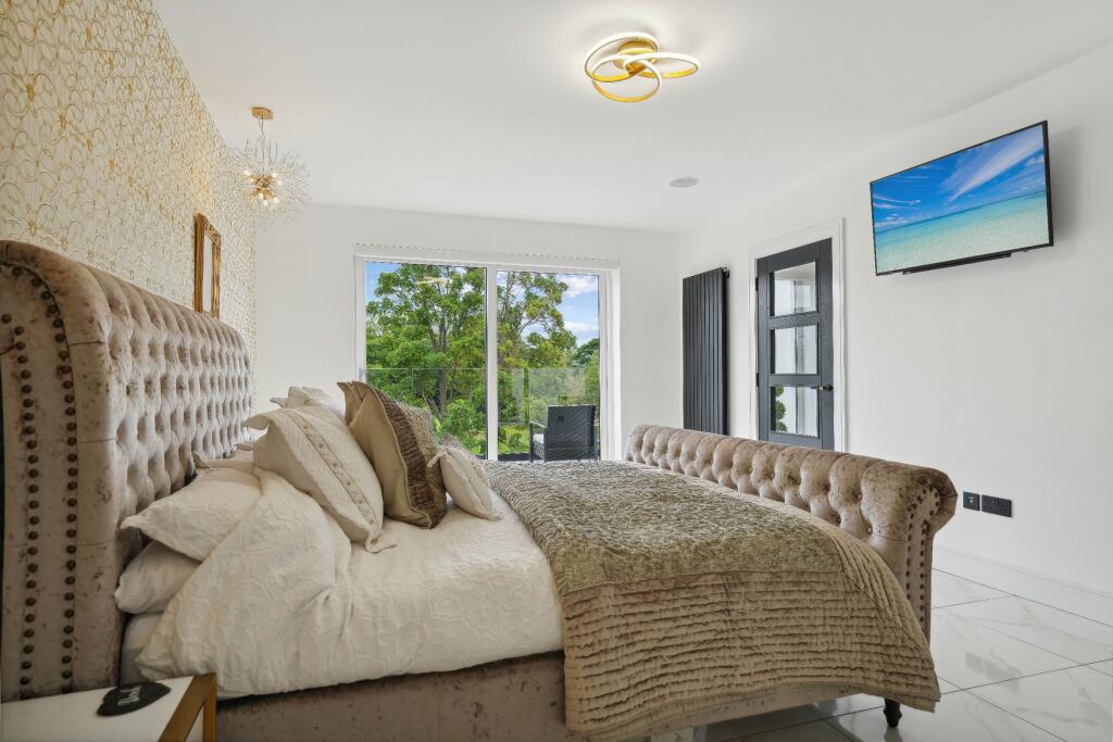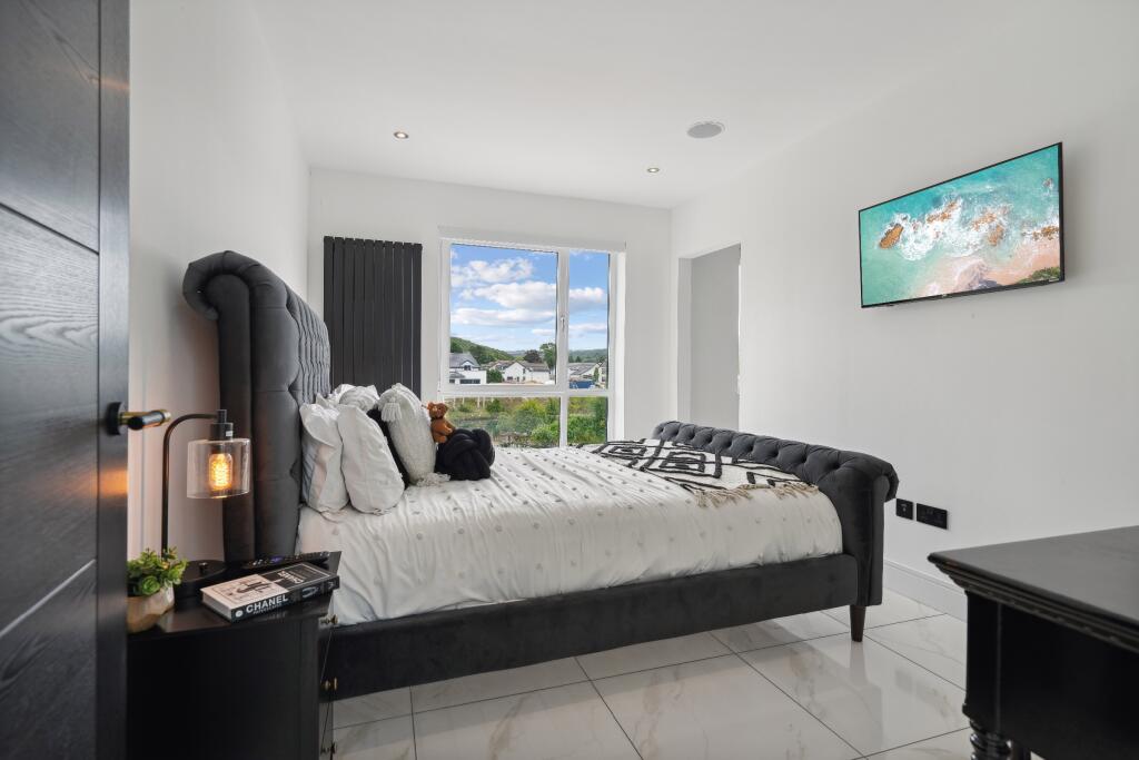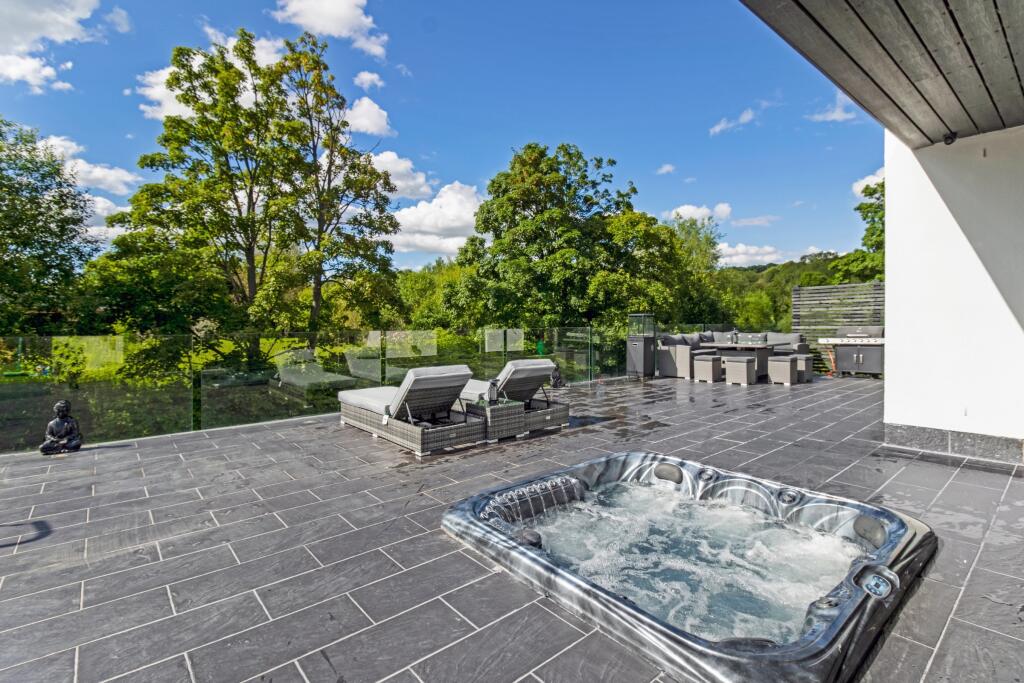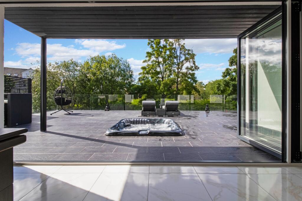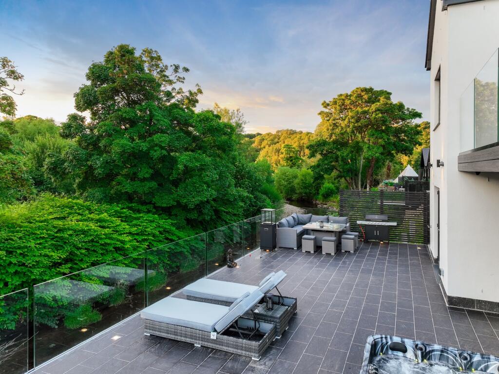 The property at Clyde Grove, Crossford, Carluke is a modern detached house featuring 4 bedrooms and 5 bathrooms. The interior is finished to a high standard, with modern fixtures and fittings throughout, including a stylish kitchen and bathrooms. The property also benefits from a large outdoor terrace area with a hot tub, ideal for entertaining and relaxation.