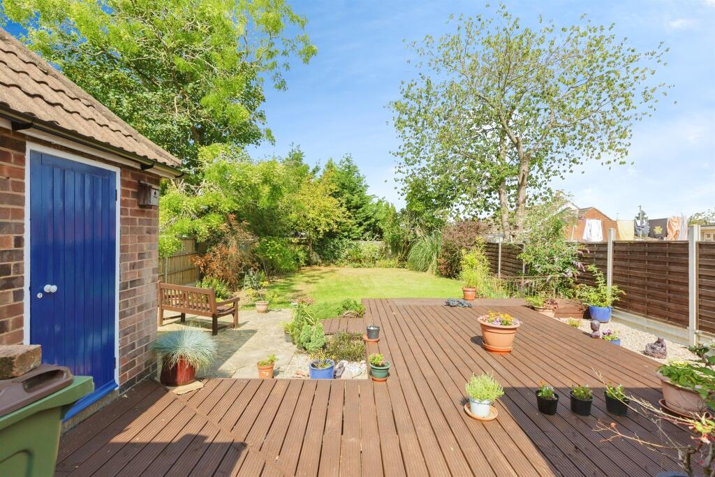 Well-presented THREE-bedroom dormer bungalow in Oadby, featuring UPVC windows/doors, modern kitchen with integrated appliances, spacious lounge diner, and rear conservatory overlooking a large garden with decking and flower beds. Includes single garage with power, plus driveway for 2–3 cars.