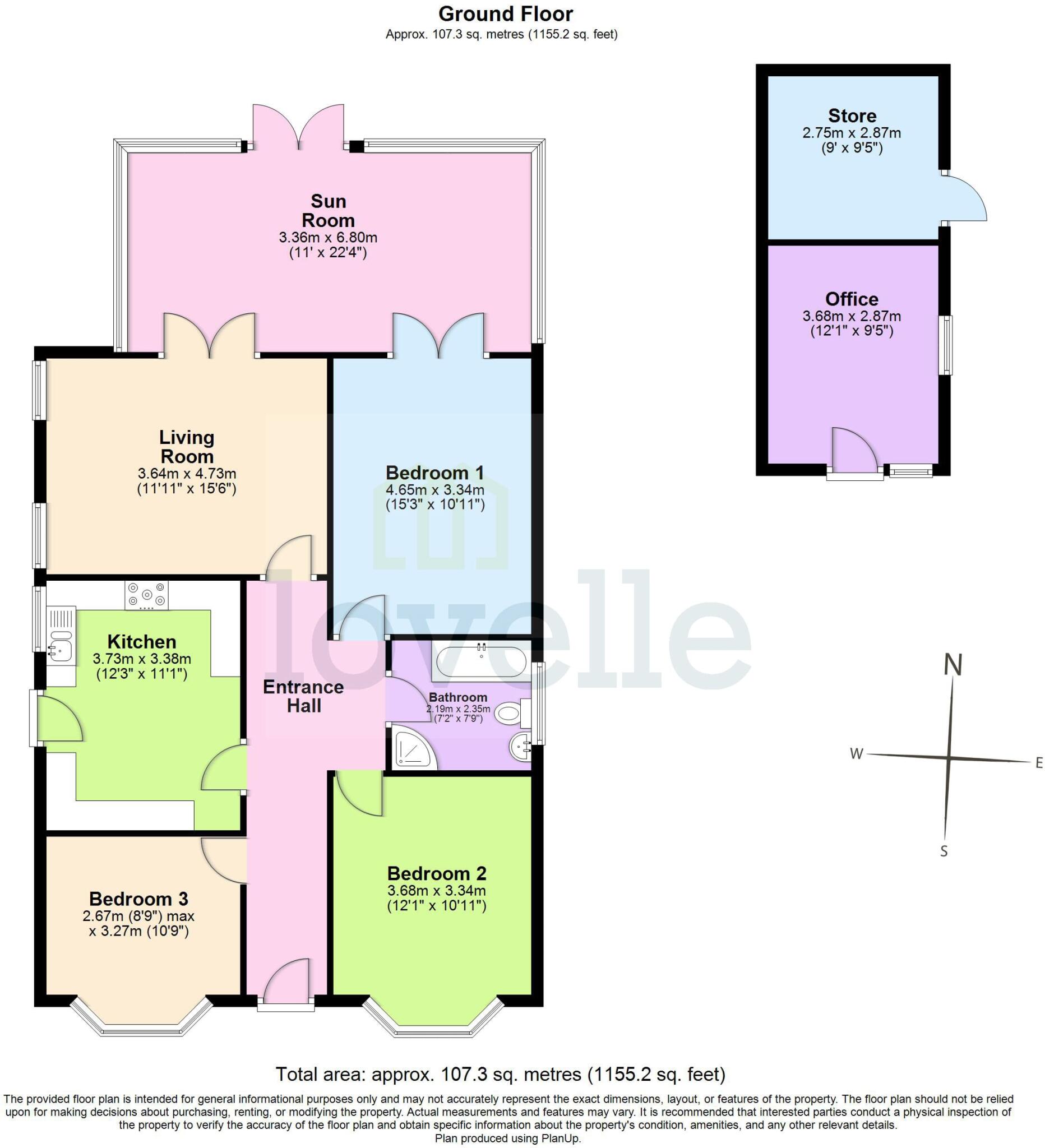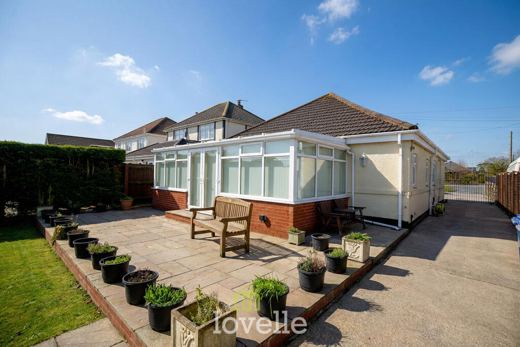 Spacious three-bedroom detached bungalow, well set back from the road, with generous garden, garage and sun room.