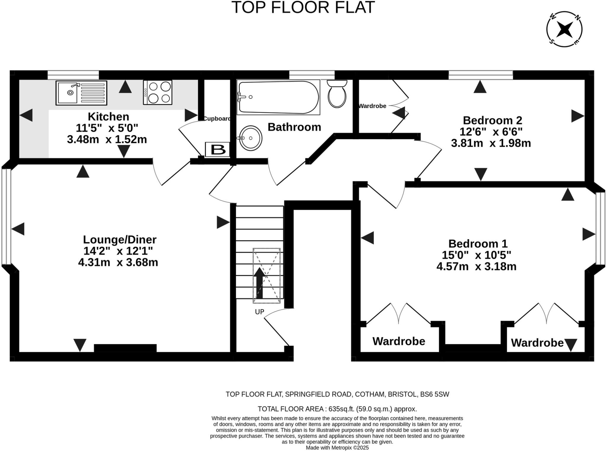 This property is a two-bedroom flat located on Springfield Road in Cotham, Bristol. The flat is on the top floor and benefits from views across the city. The property is conveniently located near several highly-rated schools, including Montpelier High School (Outstanding) and The Dolphin School (Good), both within a 0.34km and 0.30km radius respectively. Excellent transport links are also nearby, with Montpelier train station just 0.53km away. The average price per sqft in the area is £490, and while the property itself is smaller than the average at 635 sqft, its price of £315,000 is slightly below the average house price for the area of £533,726. The property appears to be in reasonable condition, although some minor updates or cosmetic improvements may be desirable. The lack of outdoor space is a notable drawback.