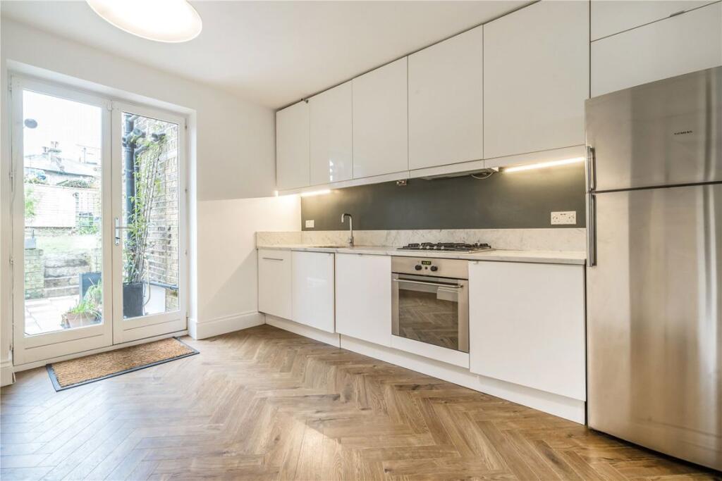 An outstanding split level three-bedroom garden maisonette, meticulously renovated and redecorated to a high standard. The accommodation comprises a spacious reception room, leading through to a sleek, fully fitted kitchen and dining area. French doors open directly onto a private west-facing gar...