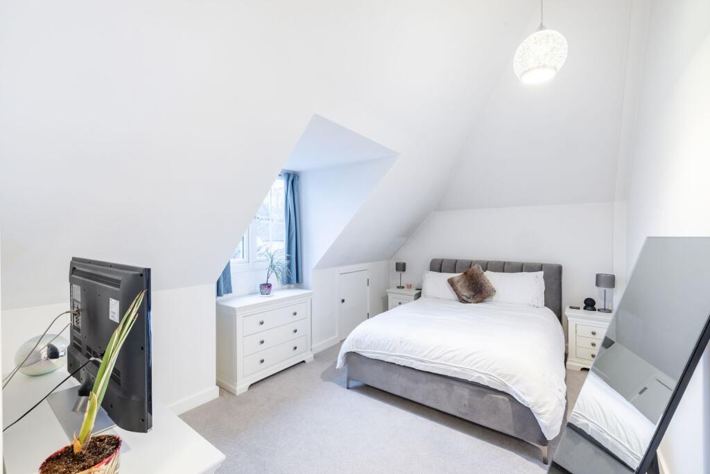 Modern two bedroom top floor apartment built in 2021, featuring high ceilings, open-plan kitchen/living space with balcony, integrated appliances and two spacious bedrooms in Purley.