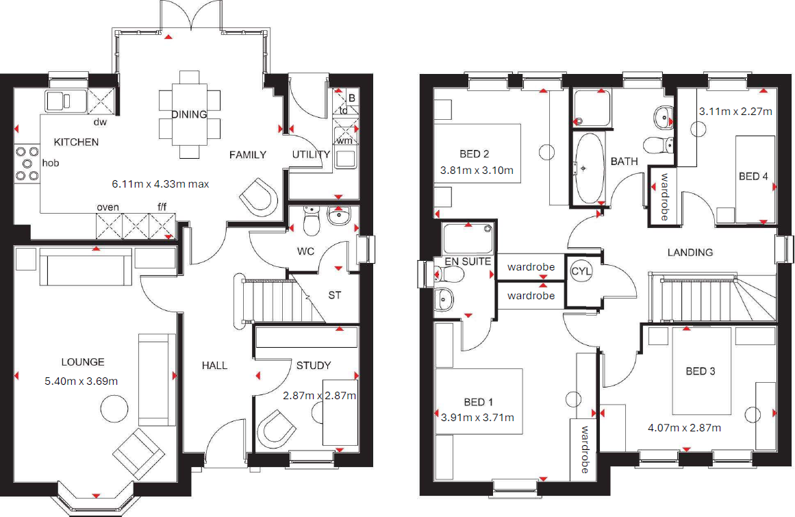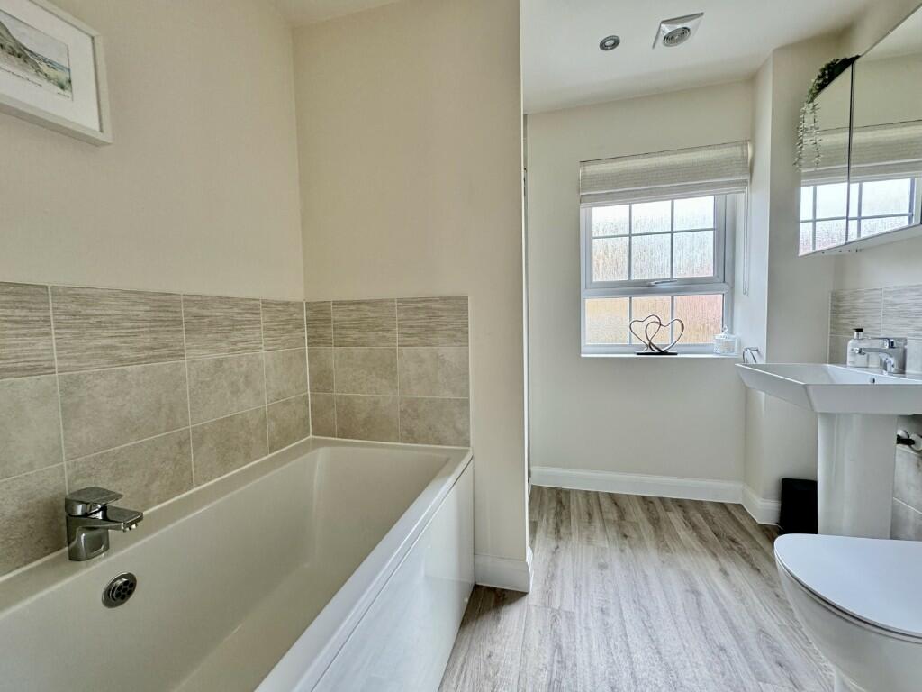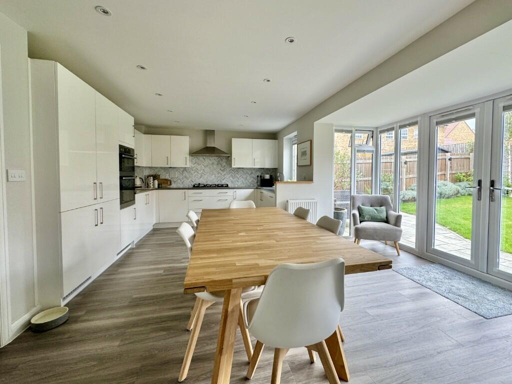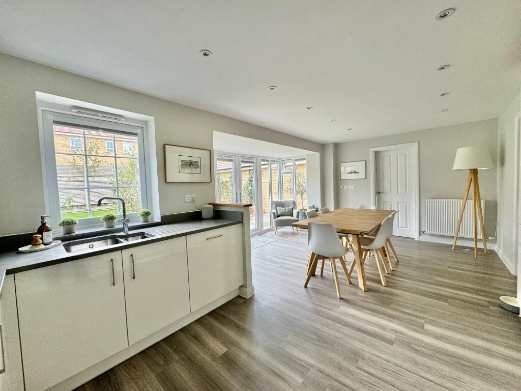 A modern detached home a short walk from the shops & school offering an entrance hall, sitting room with wood burning stove, an open plan kitchen/dining/family room, a study, cloak & utility rooms, four double bedrooms, three with built in wardrobes, an en-suite shower room and a family bathroom wit