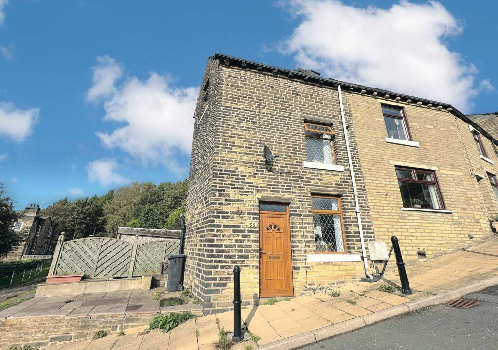 Two bedroom end terrace house with extensive views of Halifax. Features lounge, kitchen, bathroom, patio garden, gas central heating, and double glazing. Restrictions may apply.