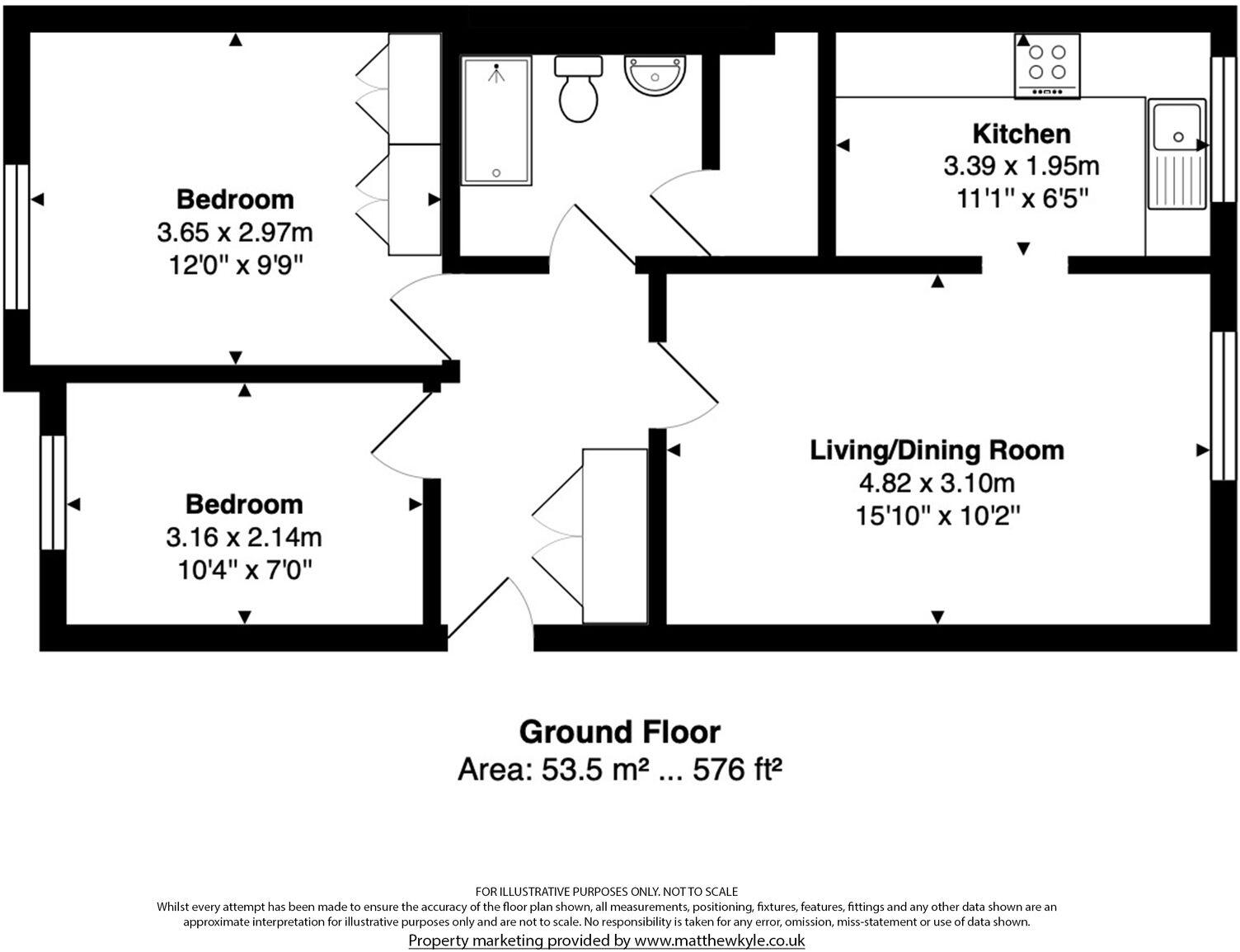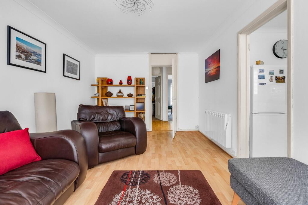 2-bed ground floor apartment, bright living/dining room, kitchen, shower room, storage, residents parking & communal gardens. Close to amenities & rail station to London. No chain, extended lease.