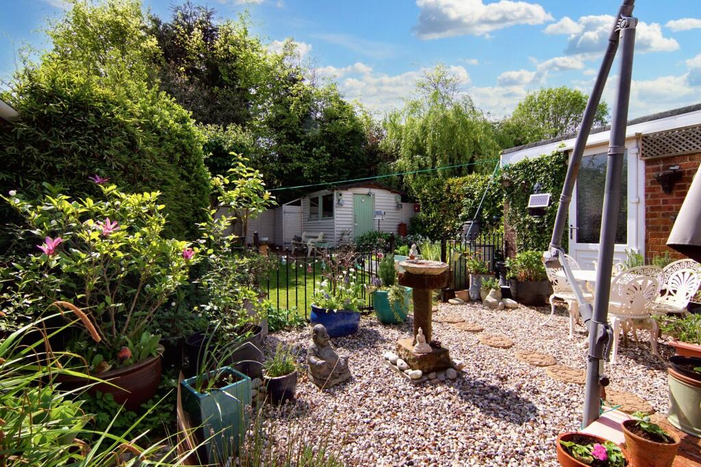 The property itself appears to be well-maintained and presented. The interior photographs show a recently updated kitchen and bathroom. The décor is modern and tasteful throughout, suggesting the property is in good condition and has been well-cared for. The garden is a notable feature, offering a good-sized lawn and patio area, ideal for outdoor entertaining. The presence of a shed provides additional storage space.