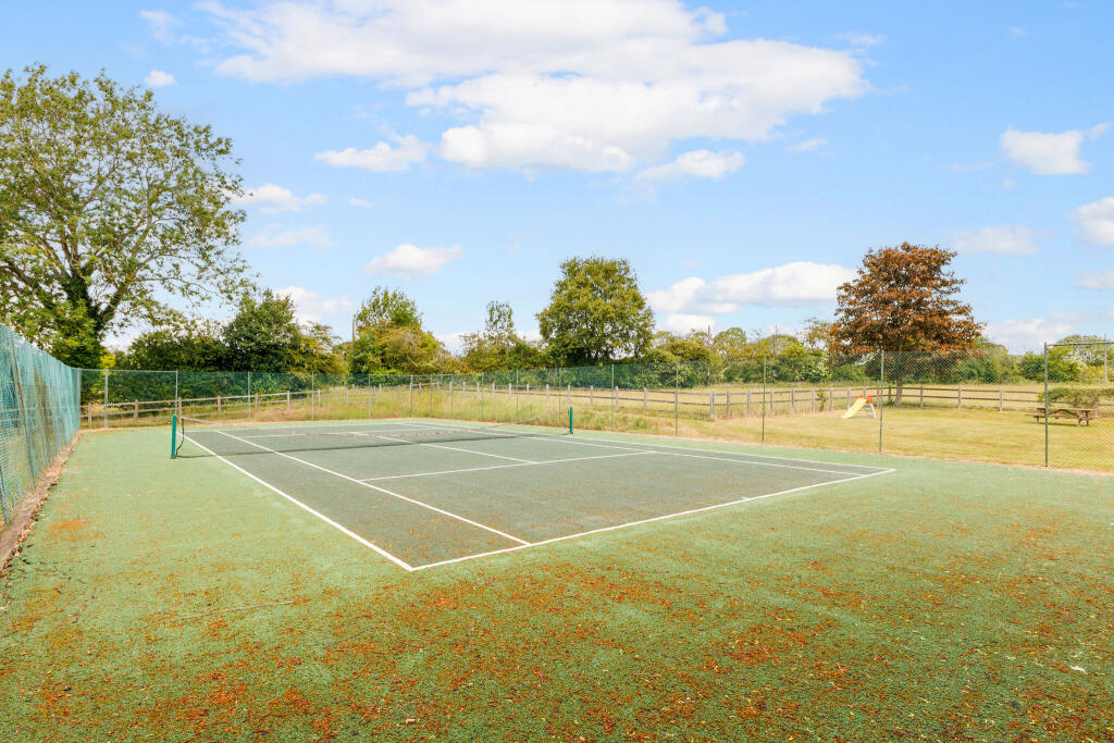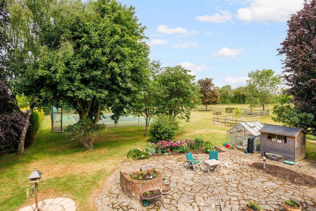 This is a detached character property located in Aston End, East Hertfordshire. The house offers four bedrooms and two bathrooms. While the property requires renovation, it features a large plot with a garden and a tennis court. The location is desirable, being rural yet accessible to amenities and transport. The property is listed with Hamptons Sales.
