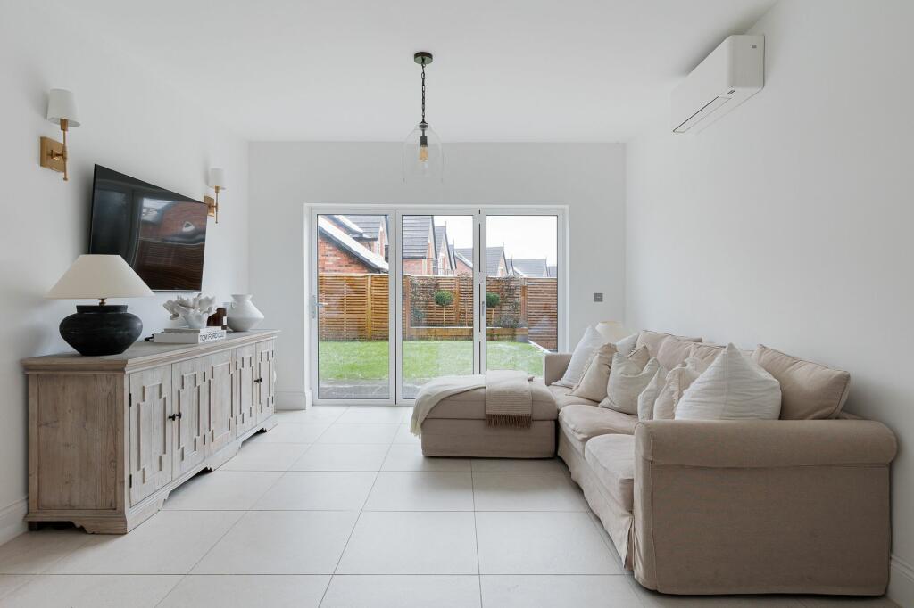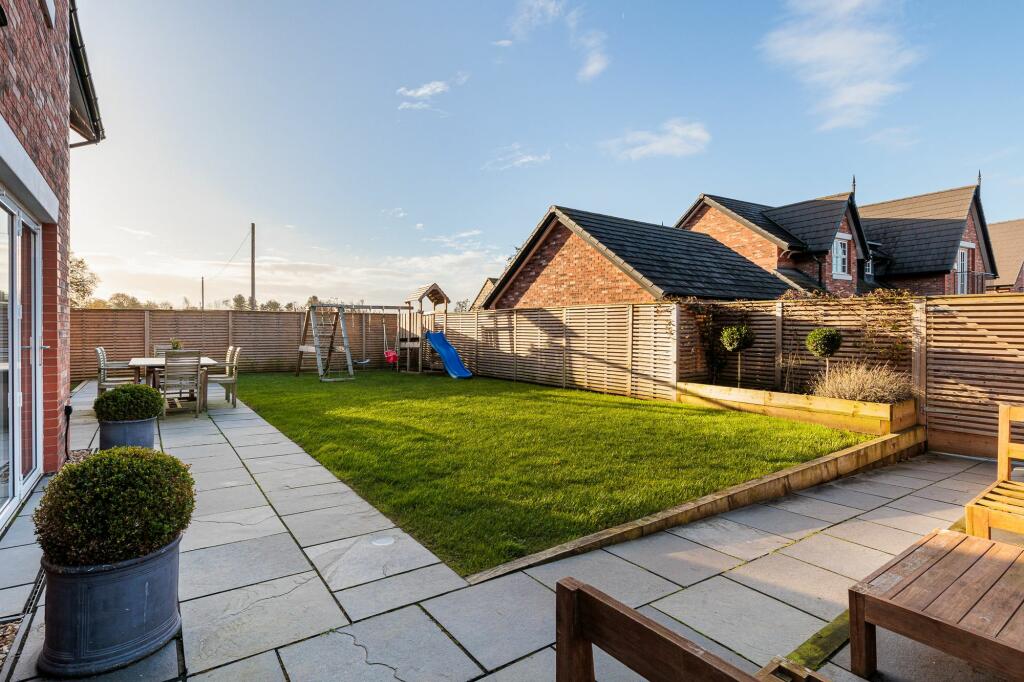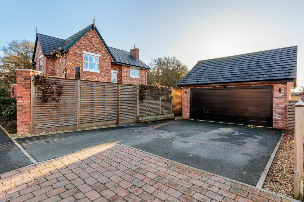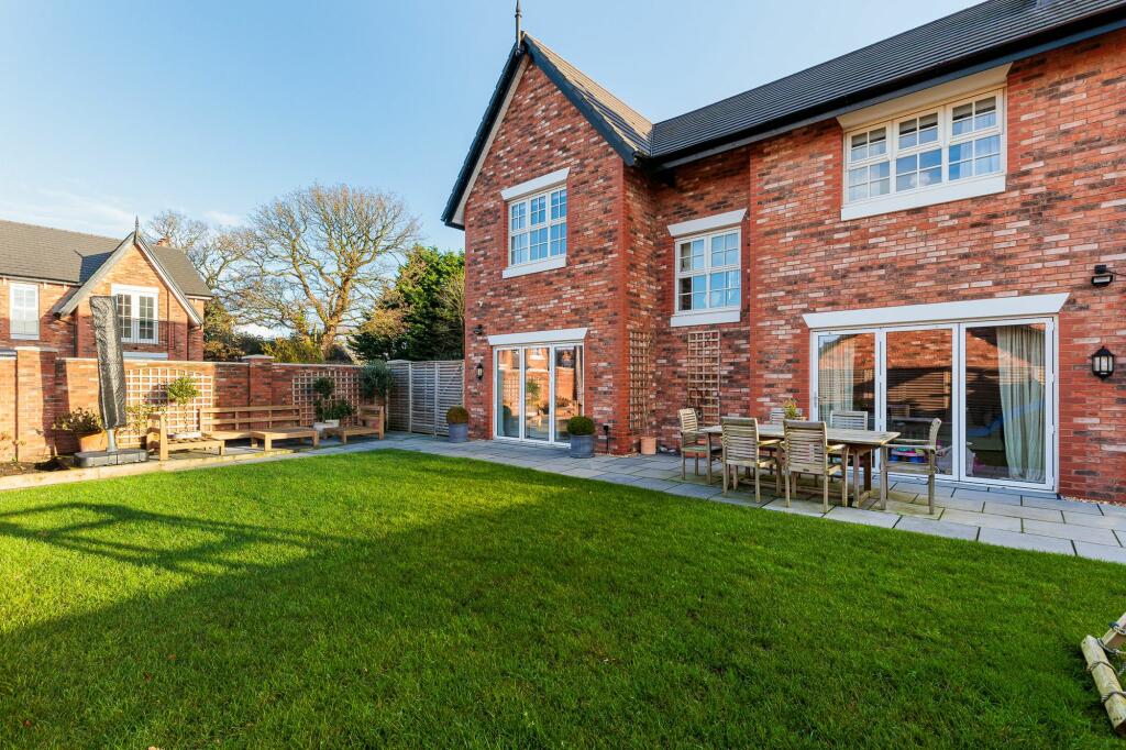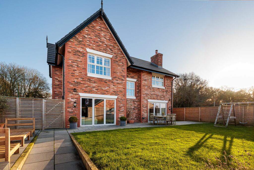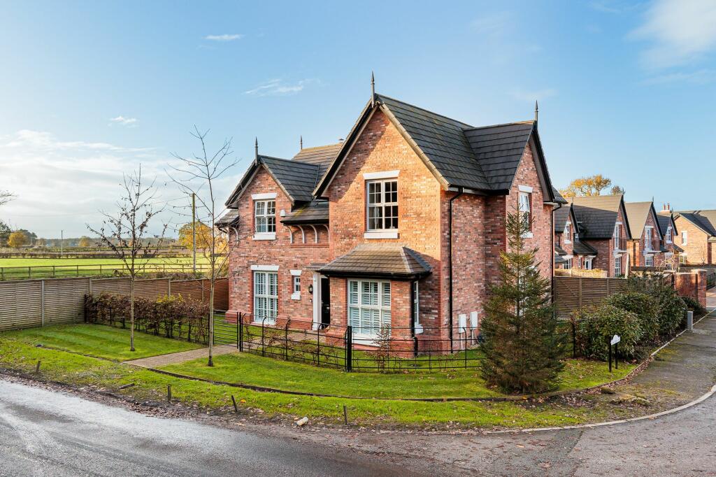 Luxurious Georgian-style home in bespoke cul-de-sac dev. Prime corner plot, 4 beds, open-plan living, double garage, landscaped garden. Ideal Cheshire location near schools, pubs, motorway links.