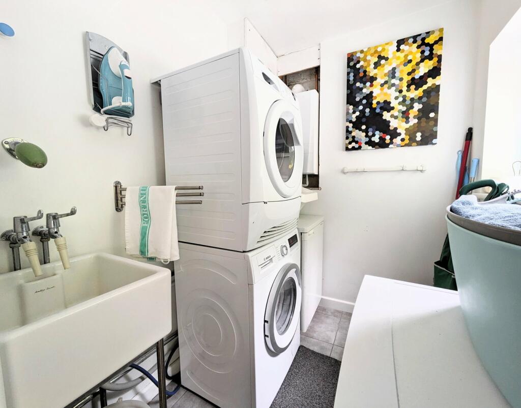 The property features a modern kitchen, a study, and a laundry room. The garden is a key feature, and the property appears to be well maintained.