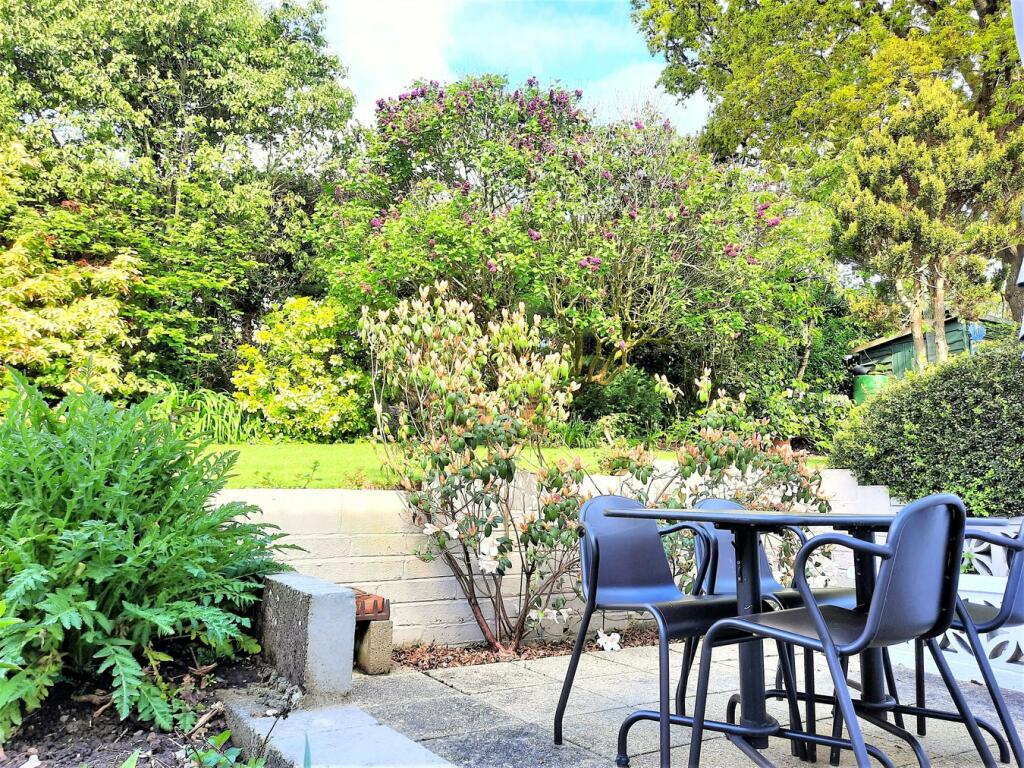 The property includes a substantial garden, offering outdoor space for relaxation and recreation. The images show a tiered garden with mature plants and trees.