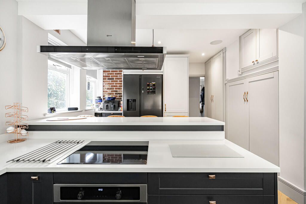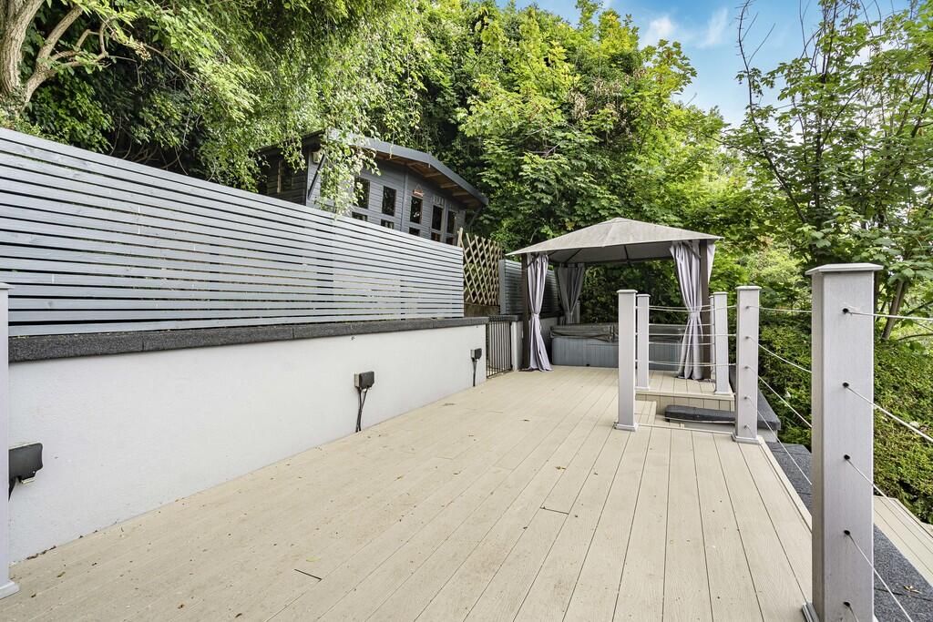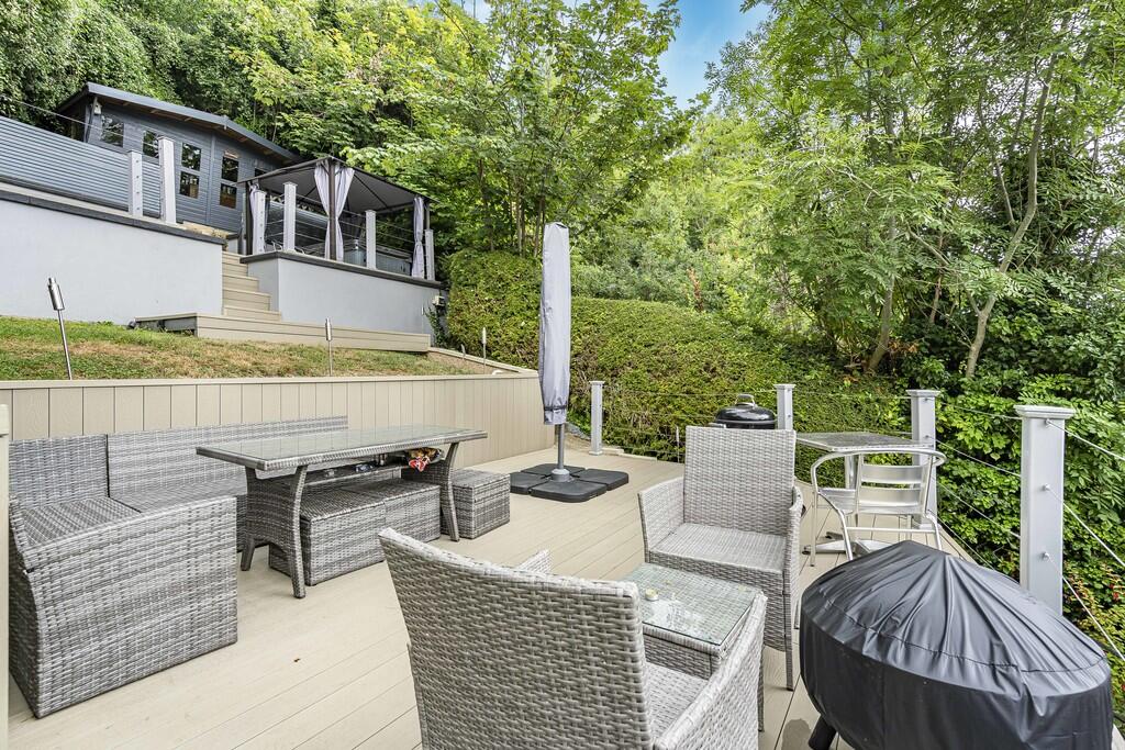 The property is a detached bungalow located on Milner Road in Caterham, Surrey. It features 4 bedrooms and 1 bathroom with a total square footage of 1,334. From the images, the property appears to be in good condition, with a modern kitchen and bathroom. The interior design choices are a mix of modern and traditional elements. The property also benefits from a large outdoor decked area with multiple levels, offering ample space for entertaining and relaxation. There is also a shed. The location is near several schools and train stations. The average price per square foot in the area is £488, while the property is listed at approximately £637 per square foot. This is significantly higher than the average for the area, but may be justified by the property’s detached status, modern renovations, and desirable features.