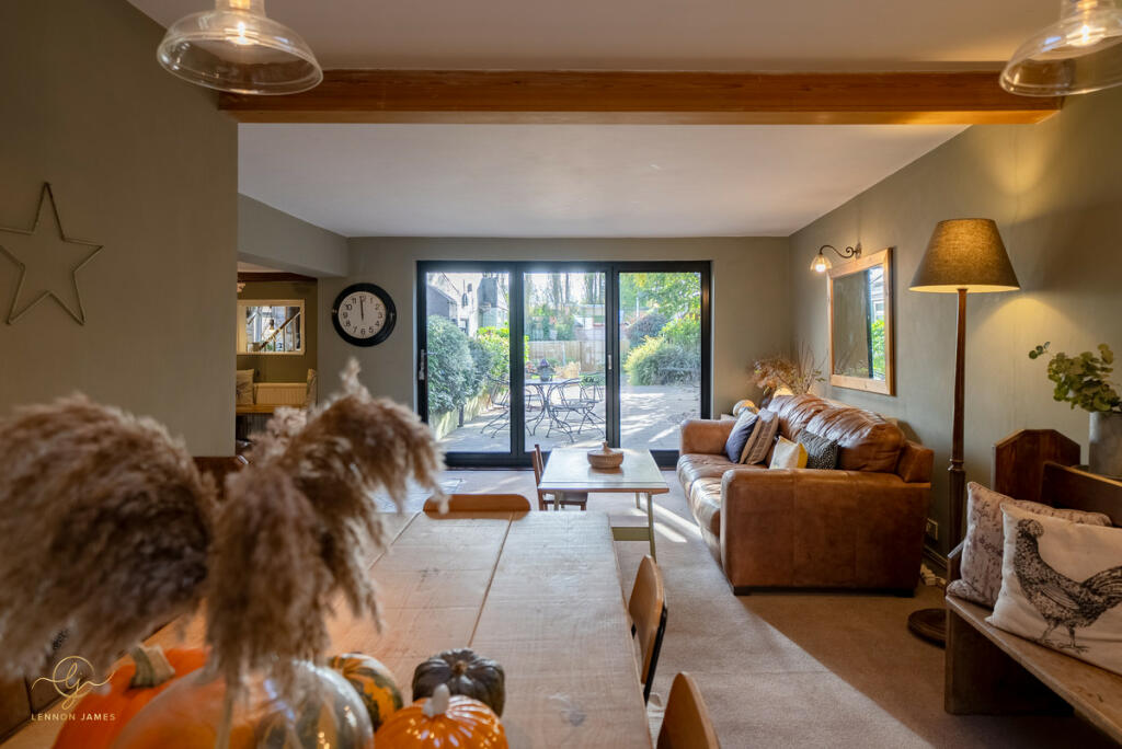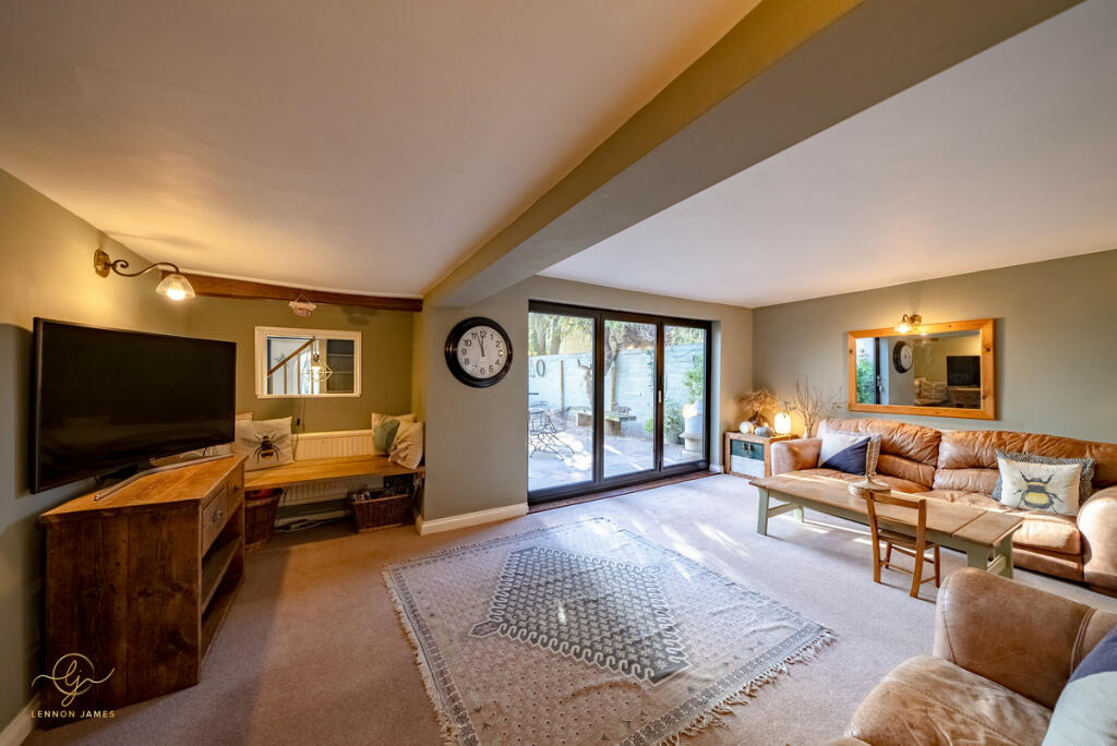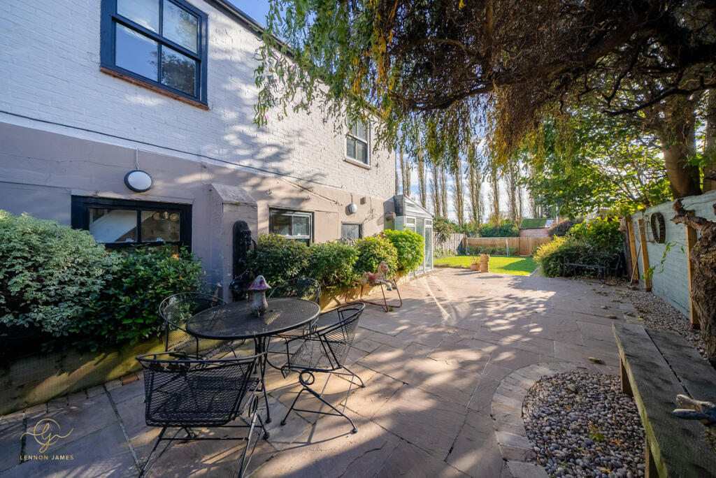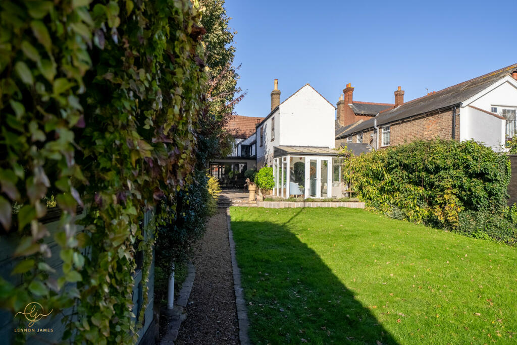 This four-bedroom, two-bathroom property located on High Street, Ramsey, Cambridgeshire presents a charming blend of old-world character and modern updates. The property’s central location offers easy access to local amenities and highly-rated schools. The images showcase a well-maintained and recently refurbished interior with a contemporary style, creating a comfortable and modern living space. The property boasts a decent-sized rear garden, including a patio area and a sunroom/conservatory that extends the living space. The garden area, which is significantly more extensive than the average town property, contains well-maintained lawn and several outbuildings.