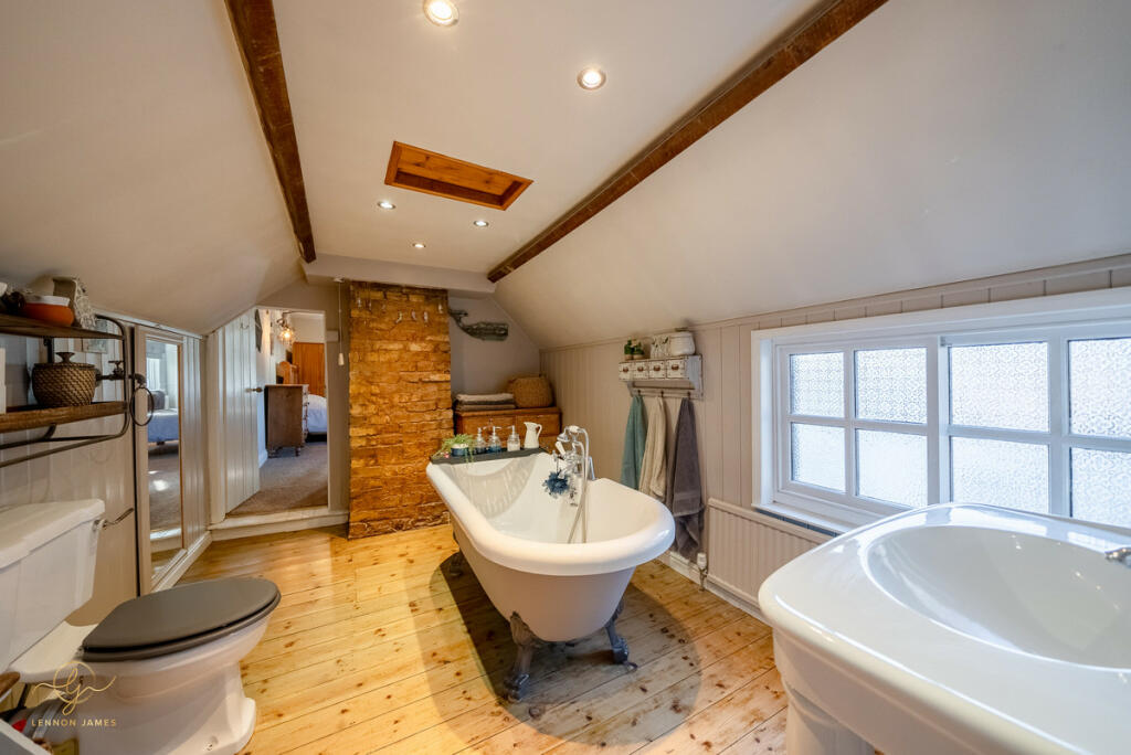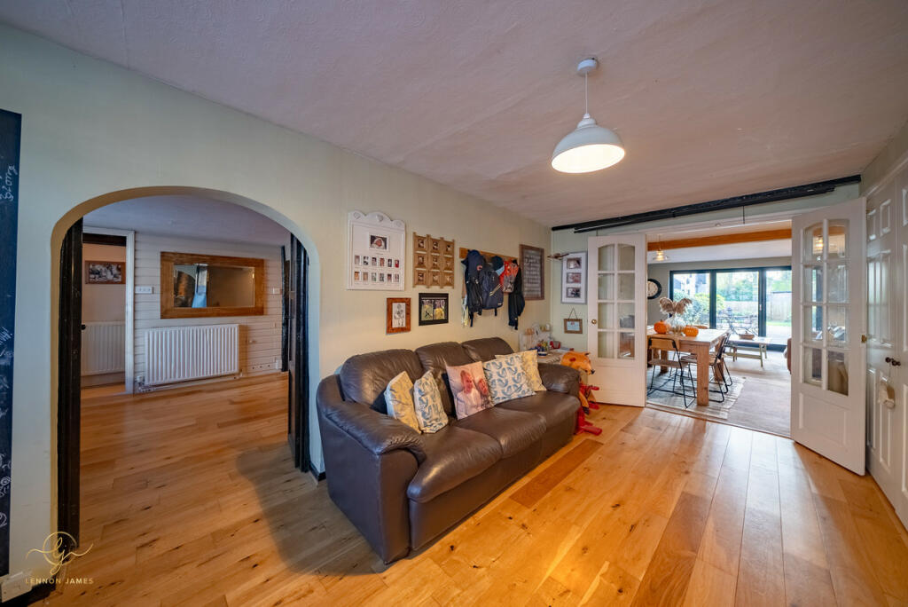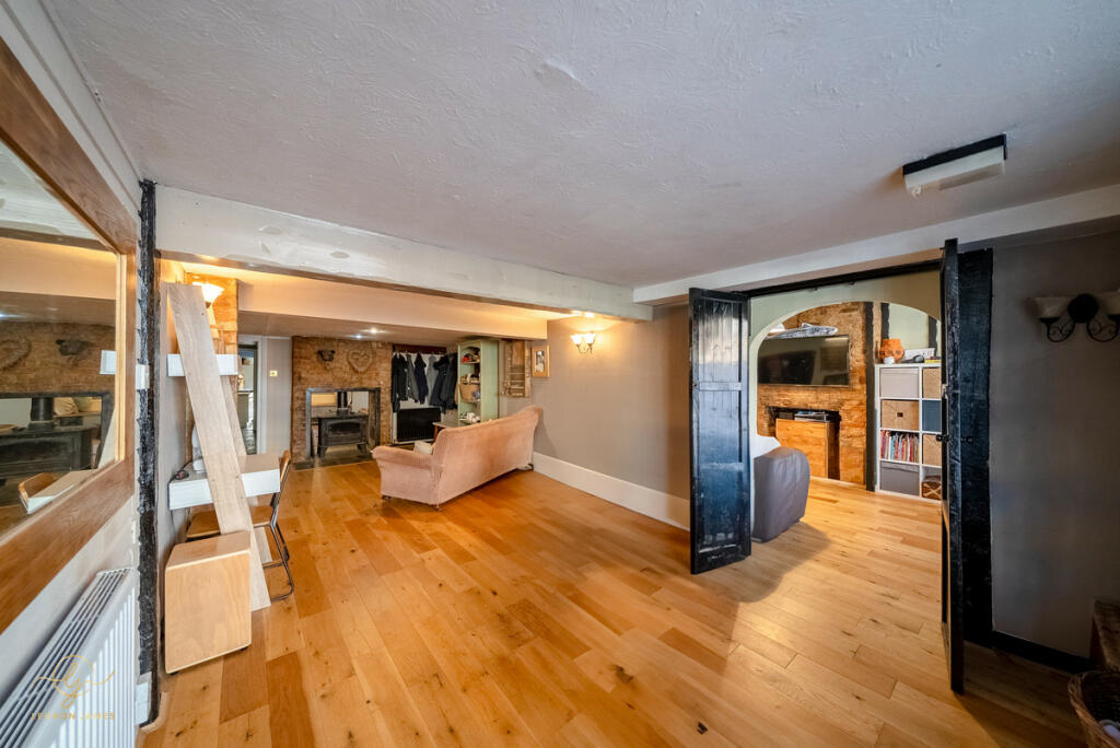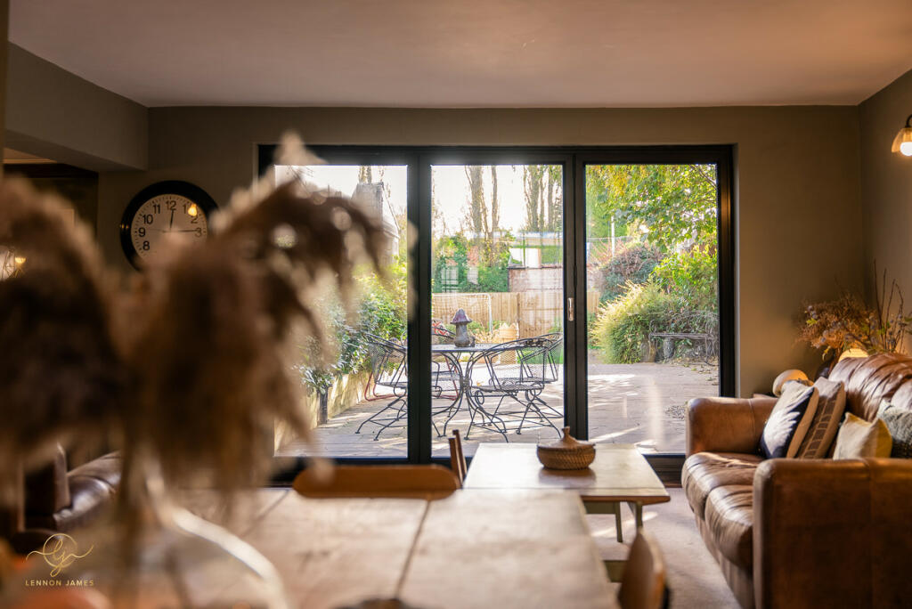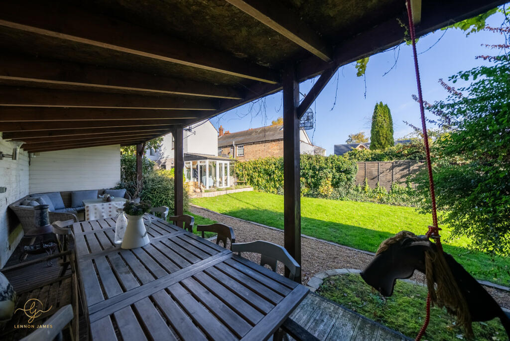 This four-bedroom, two-bathroom property located on High Street, Ramsey, Cambridgeshire presents a charming blend of old-world character and modern updates. The property’s central location offers easy access to local amenities and highly-rated schools. The images showcase a well-maintained and recently refurbished interior with a contemporary style, creating a comfortable and modern living space. The property boasts a decent-sized rear garden, including a patio area and a sunroom/conservatory that extends the living space. The garden area, which is significantly more extensive than the average town property, contains well-maintained lawn and several outbuildings.