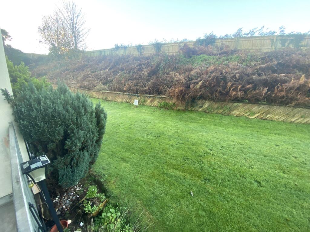 Two bedroom ground floor apartment ( 5 steps up to it) with private west facing balcony overlooking the communal gardens. Allocated parking space. Electric heating. No chain.