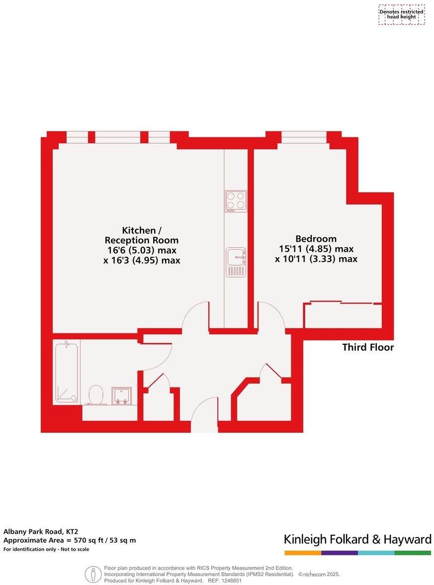 This one-bedroom, one-bathroom flat is located in Kingston upon Thames, a desirable area in Surrey. The property benefits from being close to several highly-rated schools, including The Kingston Academy and The Tiffin Girls’ School, both rated as ‘Outstanding’ by Ofsted. The proximity to Kingston train station provides convenient access to central London. The flat itself appears to be in good condition, with modern fixtures and fittings. The images show a recently renovated or newly built property, with a contemporary kitchen and bathroom. While the plot size is relatively small at 570 sqft, the property benefits from communal outside space, as shown in the images.