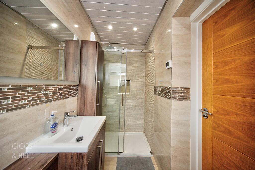 This three-bedroom end-of-terrace house in Luton, Bedfordshire, is presented in excellent condition, showcasing a recent extension that has dramatically increased the size and quality of the living space. The newly renovated kitchen is the clear highlight, offering a modern, spacious design with ample natural light from skylights and bi-fold doors opening onto the garden. The bathrooms also benefit from a contemporary style. The house appears well-maintained and boasts a comfortable layout throughout.