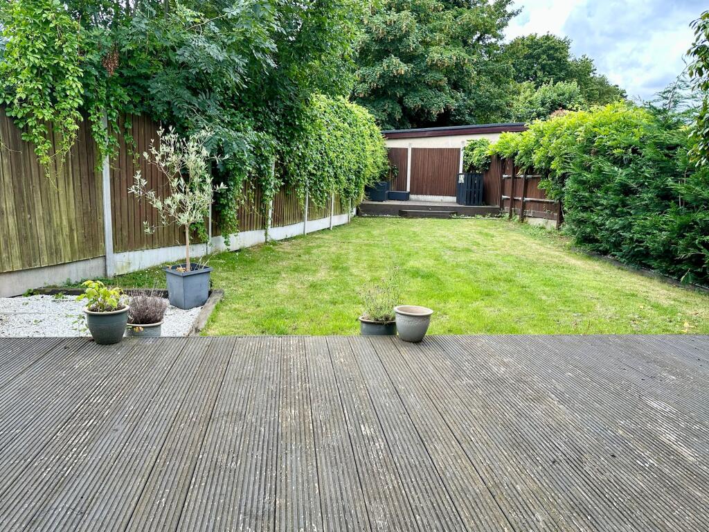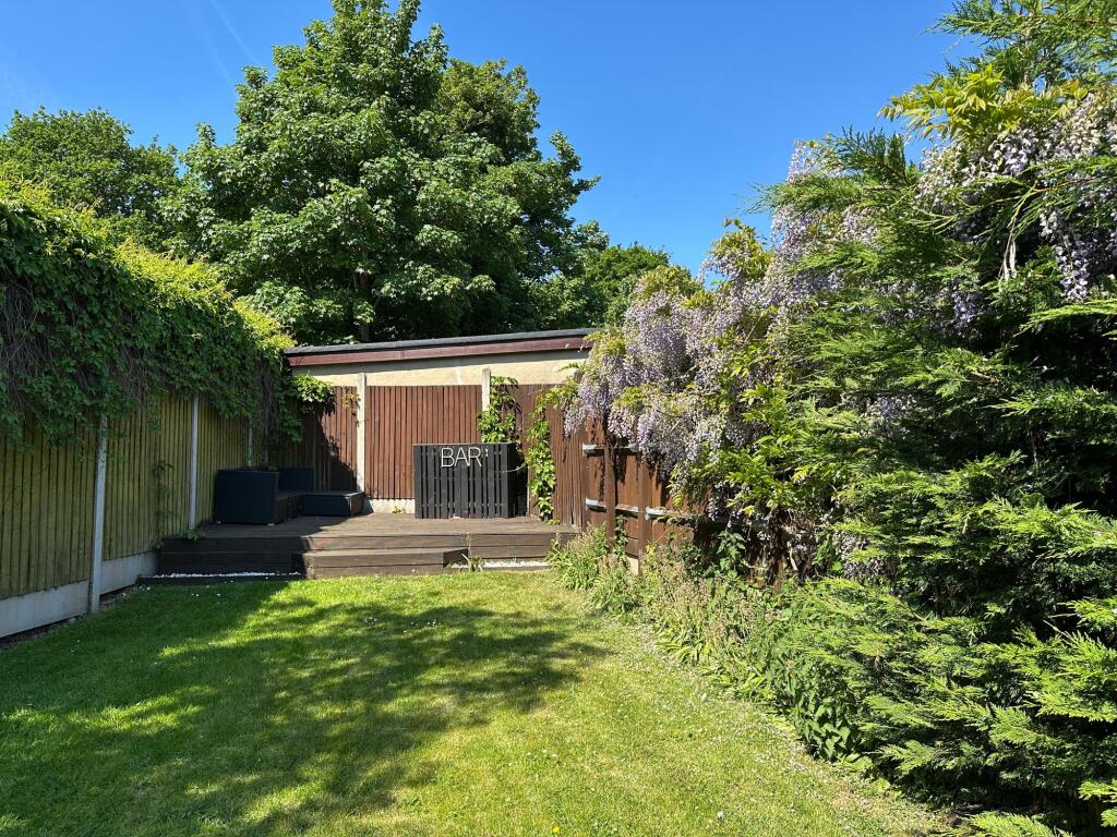 The bungalow itself appears to be in good condition based on the provided images. The kitchen and living areas have been recently modernised, featuring a contemporary design and high-quality fixtures and fittings. The garden is a notable feature, offering a good-sized lawn and patio area, ideal for outdoor entertaining. The presence of a shed and a decked area further enhances the outdoor space.