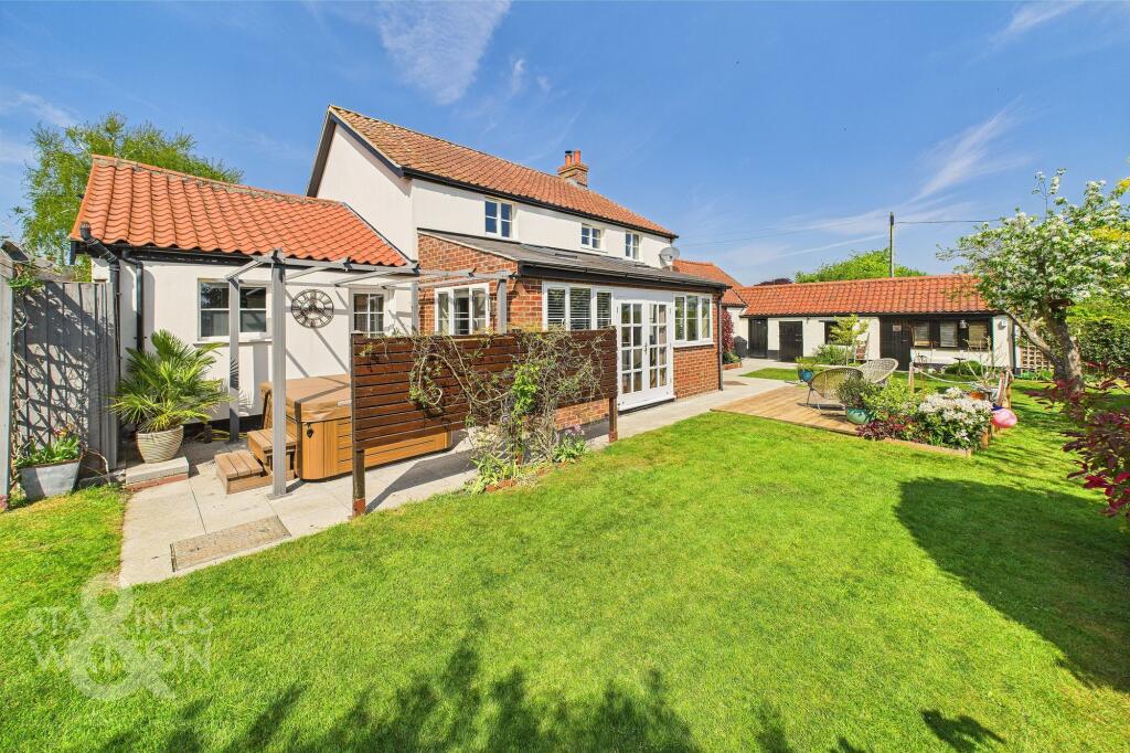 This property is a charming detached house located in the village of Burgh St. Peter, close to Beccles in Suffolk. It benefits from a large garden, ample off-street parking, and a detached garage. The house itself appears to be well-maintained and has been modernised to a good standard, with a modern kitchen and bathrooms. The location is peaceful and rural, yet still within easy reach of local amenities and transport links. The price is above the average for the area, however, the size of the property and the generous plot size justify this to a degree.