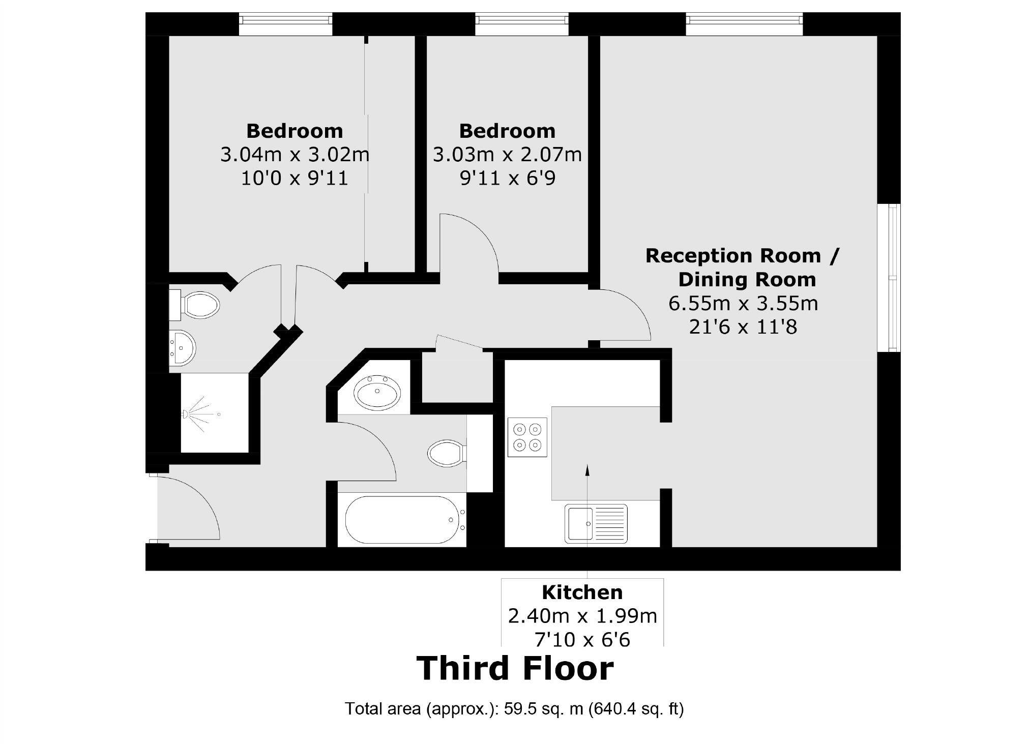 A well presented two double bedroom top floor flat to let with off-street parking in Wimbledon. This property further offers a semi-open plan living room and kitchen and two bathrooms.