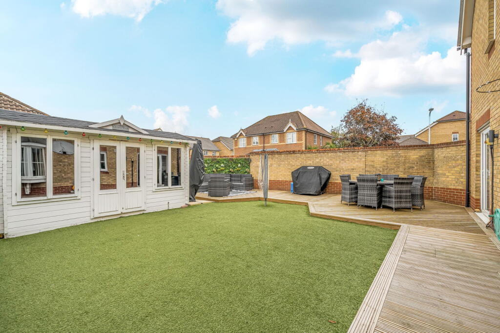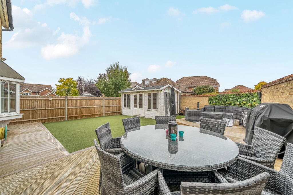 This is a detached property located on Woolbrook Close, Rainham, Gillingham. The property boasts four bedrooms and three bathrooms, with two ensuites. The property is in good condition, with a modern kitchen and bathrooms. The garden is a good size and includes a shed/bar area. The property benefits from off-street parking for four cars. The property is located 1.54 KM from Rainham (Kent) train station. Nearby schools include Riverside Primary School and Leigh Academy Rainham. The property is listed for £525,000, which seems high compared to nearby listings.