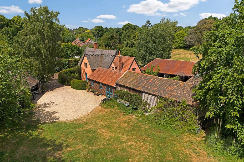 A Grade II listed former farmhouse with outbuildings and 1.4-acres of land, situated on the rural fringes of this well-served village. No onward chain.