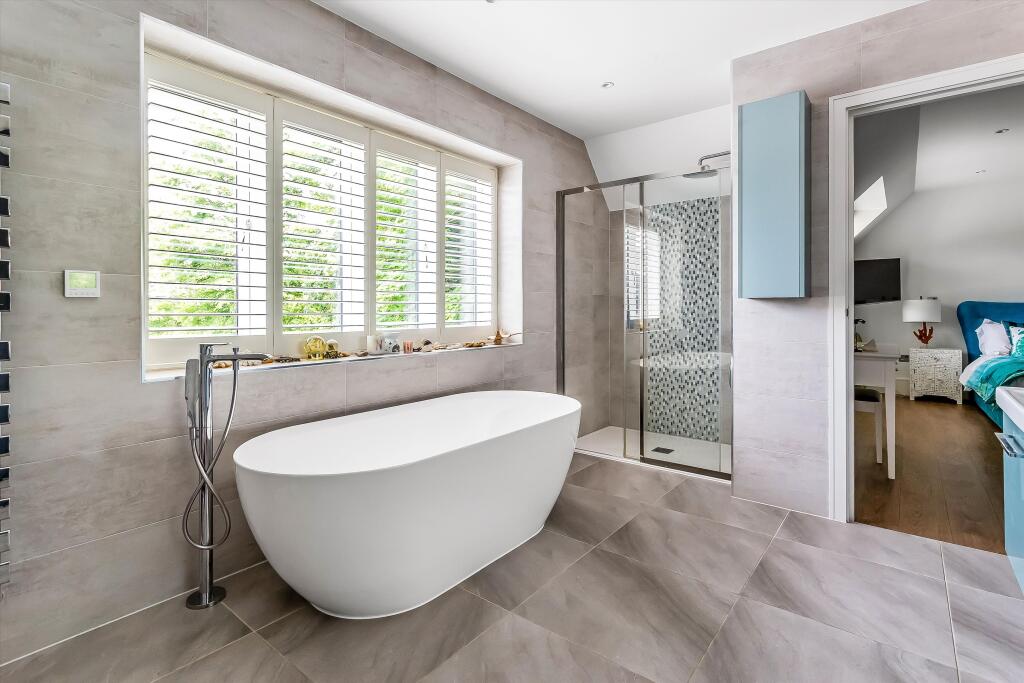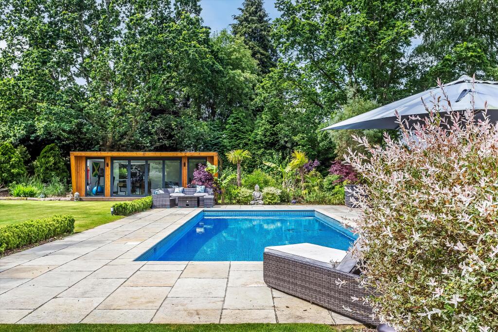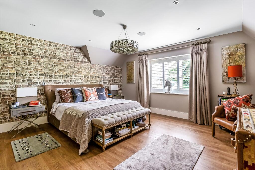 Six bedroom detached home for sale in Private Road, near Ripley, GU23. Stunning family home on a popular and desirable private road near Ripley. The property is arranged over three floors and is approximately 5160 sq ft with a detached, triple oak-framed garage/barn. On the ground floor, the p...