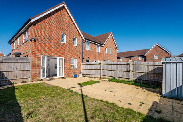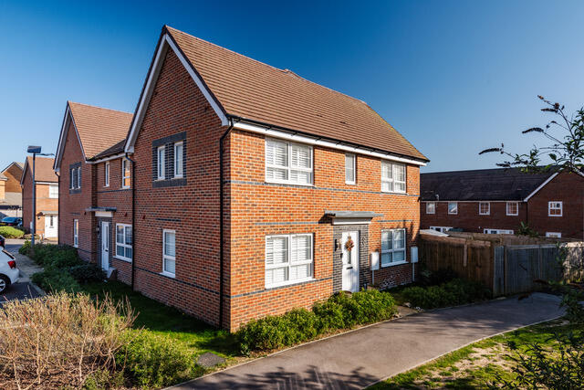A superbly presented five year old double fronted end of terraced three bedroom house with south/west facing garden, 2 reserved parking spaces, fabulous kitchen/dining room, en suite shower room and family bathroom quietly situated onto a footpath