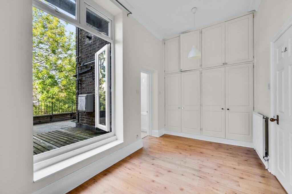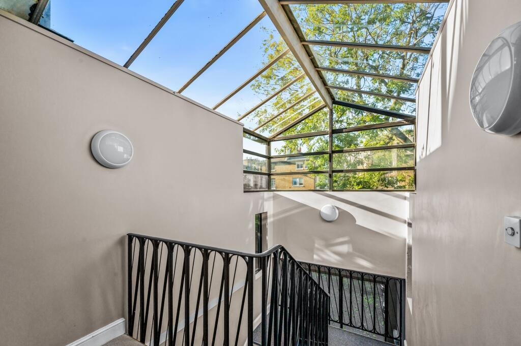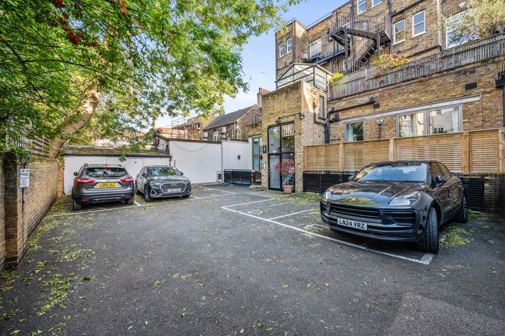 High ceilings and ample natural light. South-facing balcony and private roof terrace. Front and rear access, secure parking. Wooden floors, open kitchen, en-suite bathroom & guest WC.