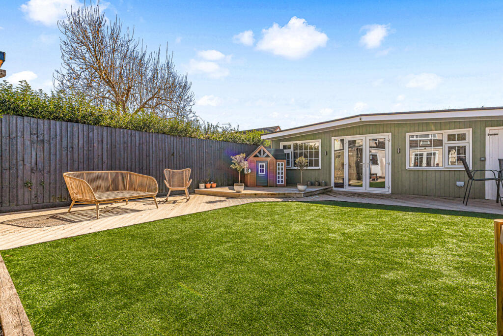 The property includes a substantial garden with a patio and artificial lawn. The garden is well-maintained and offers ample space for outdoor activities and entertaining. The additional outbuildings add to the overall appeal and functionality of the outdoor space.