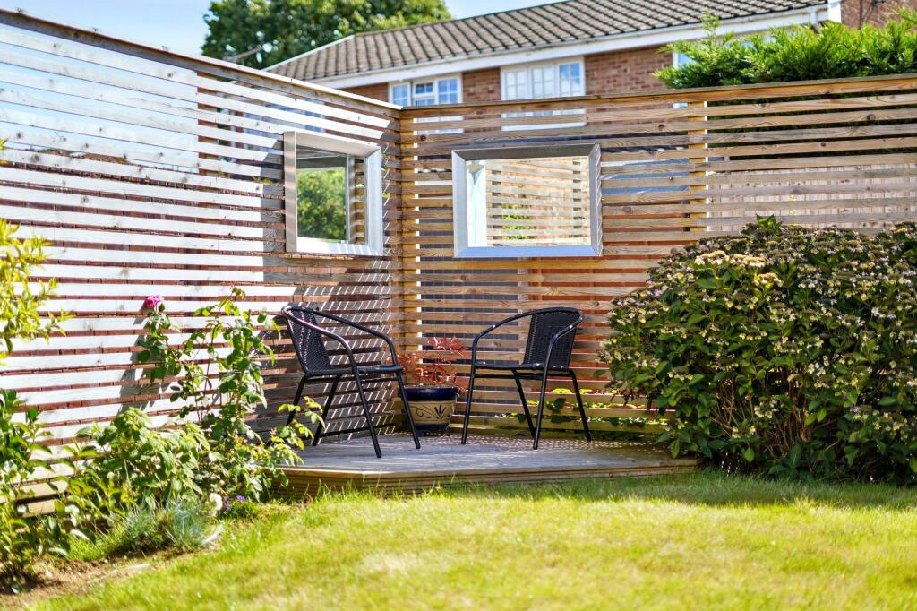The property includes a well-maintained garden with a patio area, lawn, and shed. The outdoor space is suitable for relaxation and recreation.