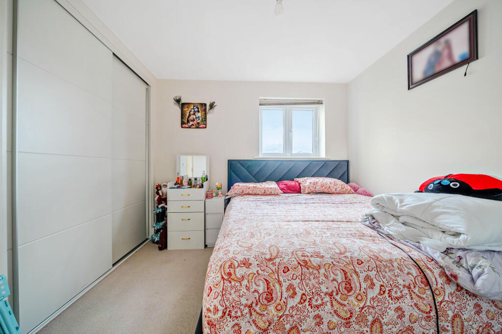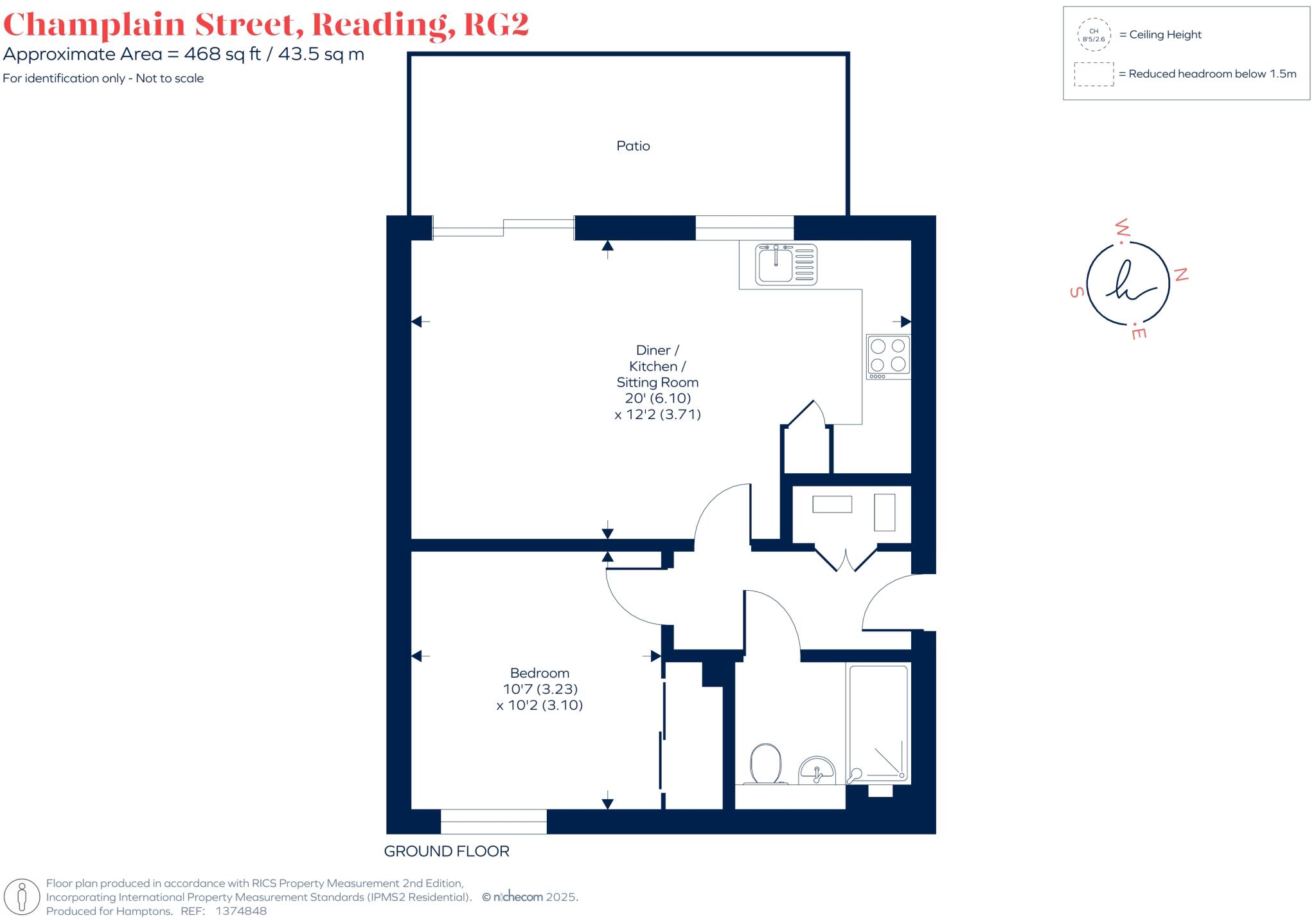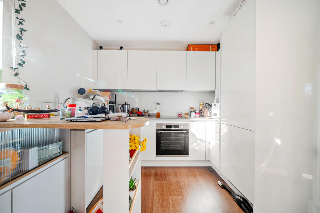 This is a one-bedroom flat in Whitley, Reading, presented by Hamptons Sales. The property is modern and appears to be in good condition. It features a well-maintained interior, a modern kitchen and bathroom, and a small patio area. While the price per square foot is higher than the area average, the condition of the property may justify the premium. The location offers proximity to schools and transport links, making it suitable for individuals or couples.