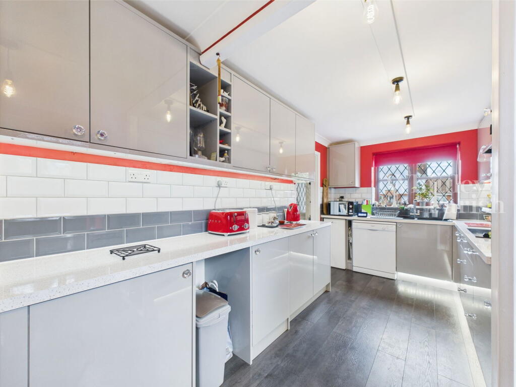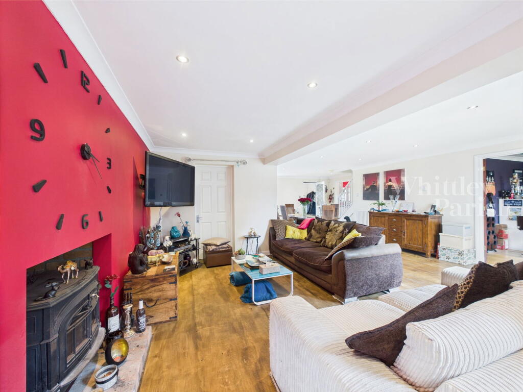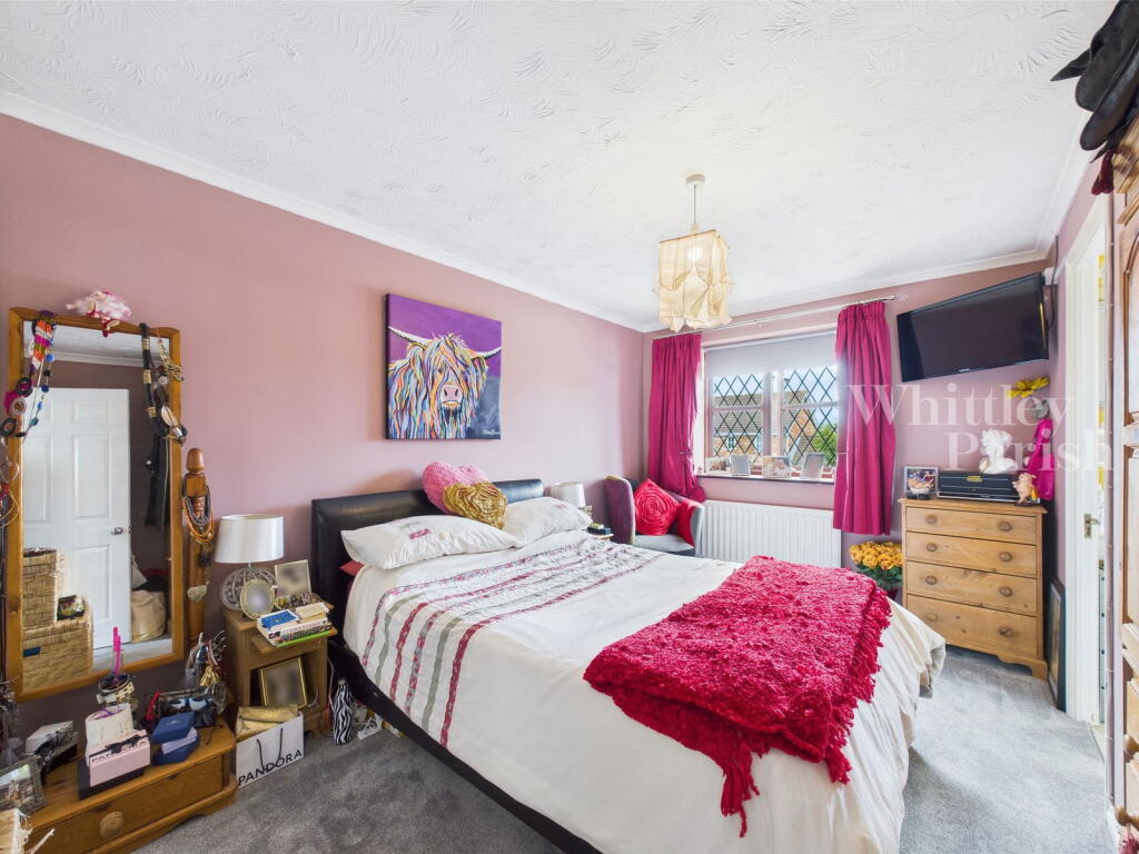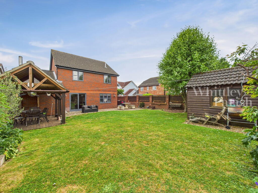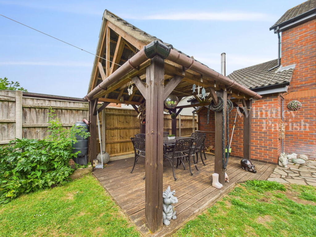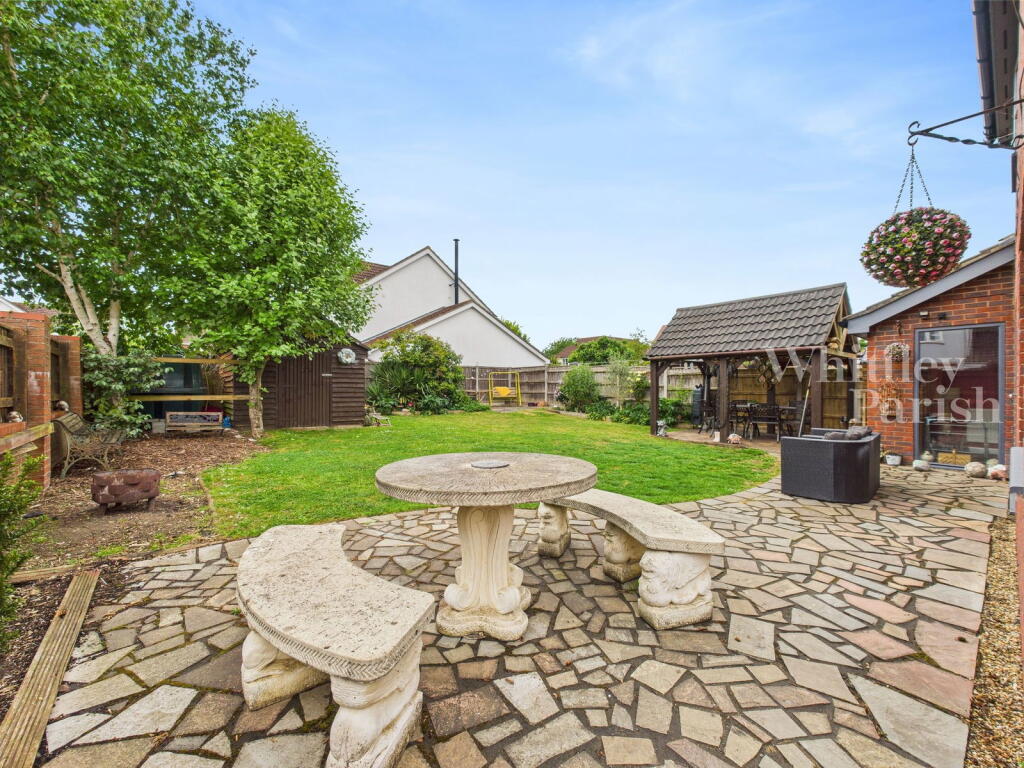 This is a detached property located on Alexander Close in Long Stratton, South Norfolk. It features four bedrooms and two bathrooms, with a total square footage of 1,355. The property includes a modern kitchen, a spacious living/dining area, and a good-sized garden with a patio and gazebo. While some interior decor may benefit from updating, the property appears to be well-maintained overall. It is conveniently located near local schools and amenities. The property benefits from off street parking and a garage. The property also has a utility room.