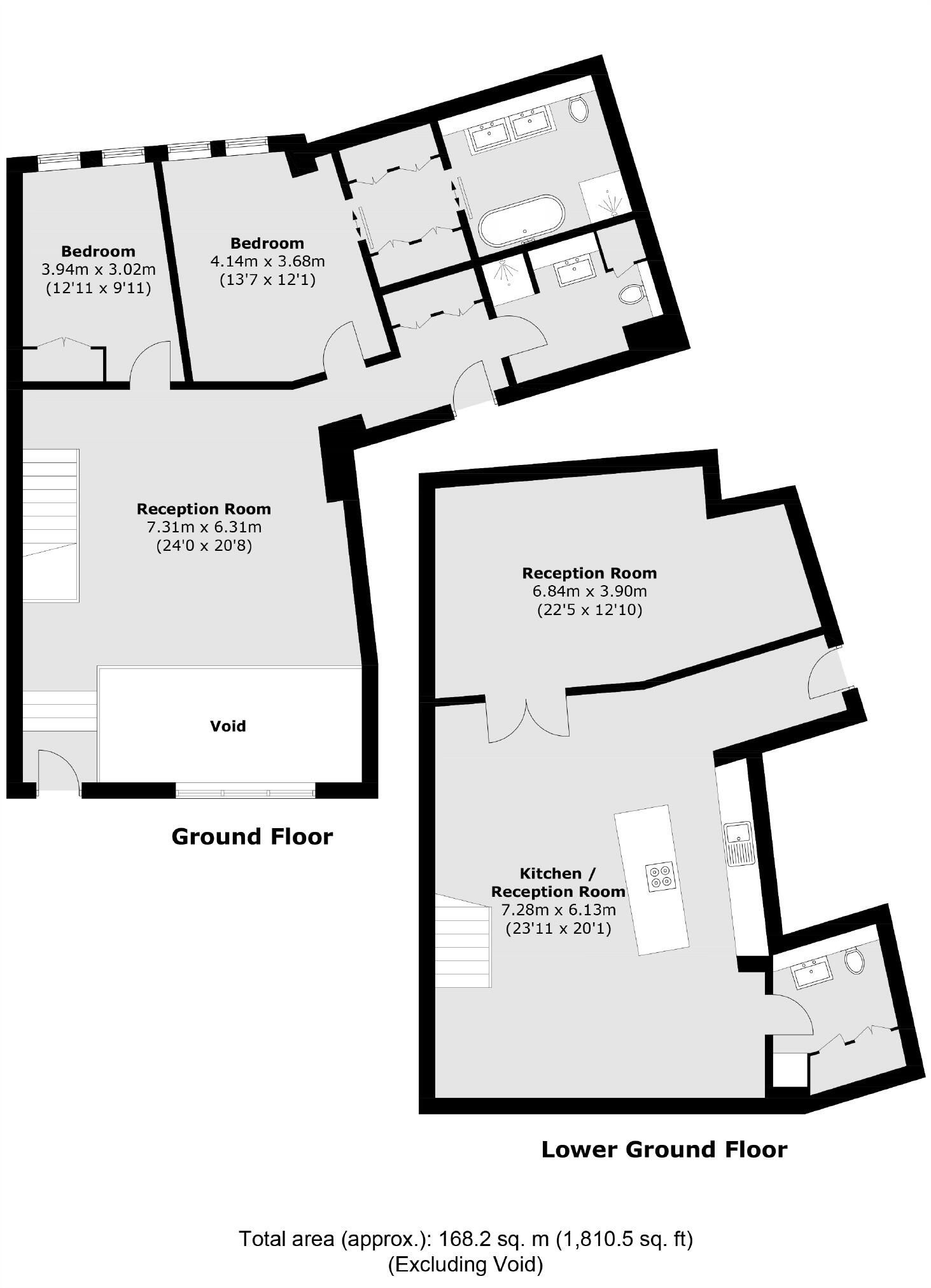 A modern, split level two-bedroom, two-bathroom apartment. The upper floor is comprised of a large reception room, a master bedroom with an en-suite dressing room and bathroom and a second bedroom, also with an en-suite facilities. The fully fitted kitchen with dishwasher, large fridge/ freezer, ...