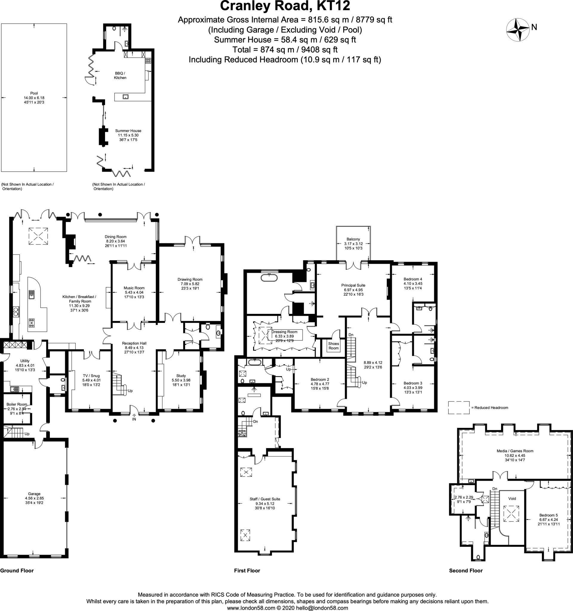 The house also benefits from impressive outdoor space, which includes a large, well-maintained lawn, a substantial swimming pool, and what appears to be a pool house or summer house. The property’s location in Burwood Park is highly desirable, offering a tranquil setting within a gated community known for its prestige and security. The excellent schools nearby and proximity to Walton-on-Thames train station provide further benefits.