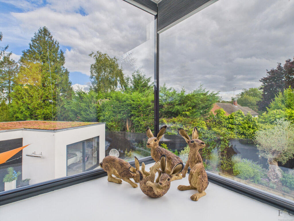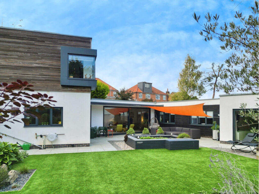 A striking eco home in Kibworth Harcourt with 3/4 double bedrooms, 2 bathrooms, open-plan living, and a landscaped garden, combining contemporary design with efficiency in a private village setting