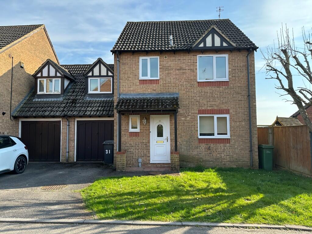 Four bedroom link detached house available unfurnished. Living/dining room, cloakroom, kitchen/breakfast room with appliances, four bedrooms, family bathroom, single garage, gas central heating. Gardens backing onto open space.