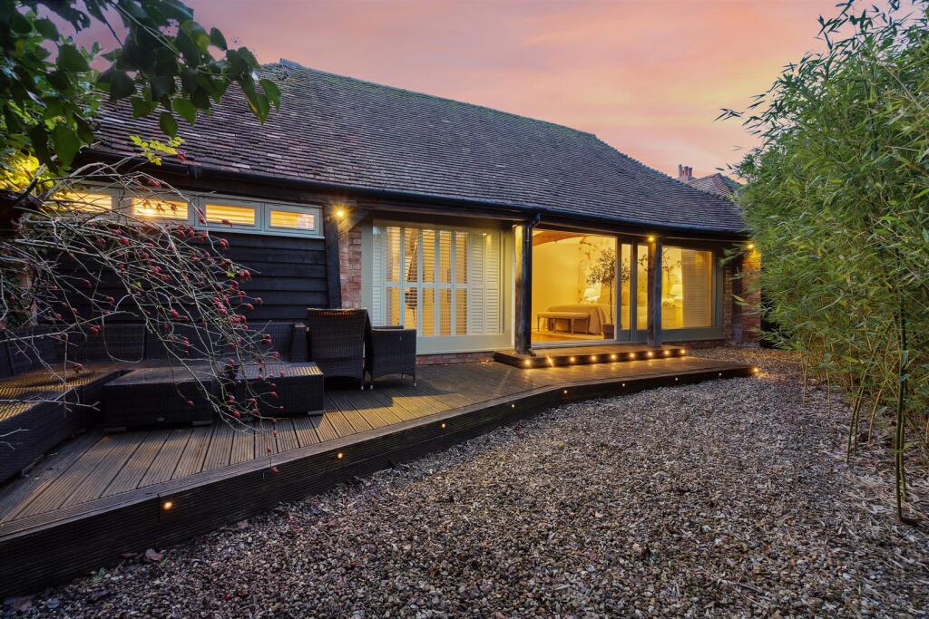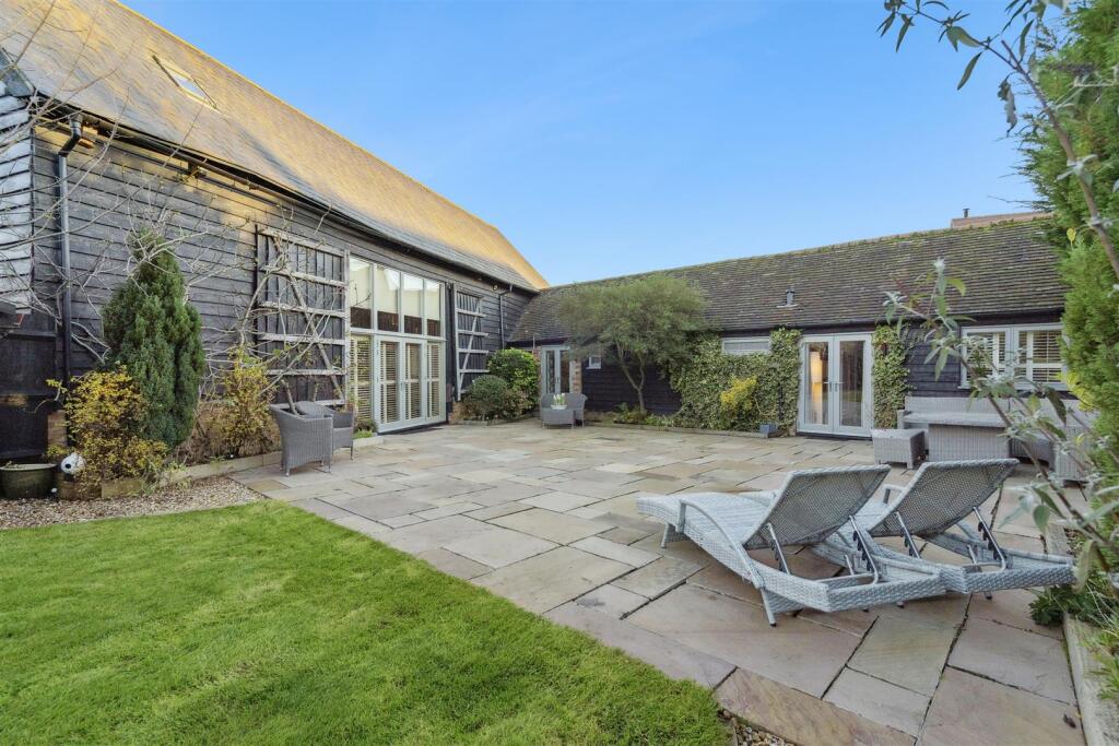 The conversion itself appears to have been executed to a high standard, with the exposed beams providing a charming focal point against the sleek, contemporary interior design. The high-quality finishes and modern amenities are evident throughout the images. The open-plan living area features large windows, allowing ample natural light to illuminate the space. Multiple bedrooms and bathrooms cater to a family’s needs. The presence of a substantial garden, complete with a patio area, enhances the property’s appeal, and the outbuilding provides extra storage and utility space.