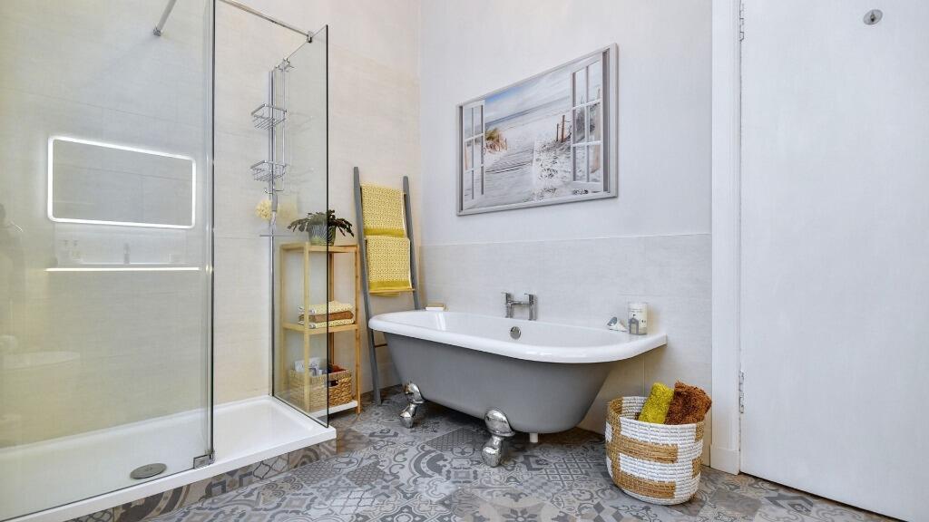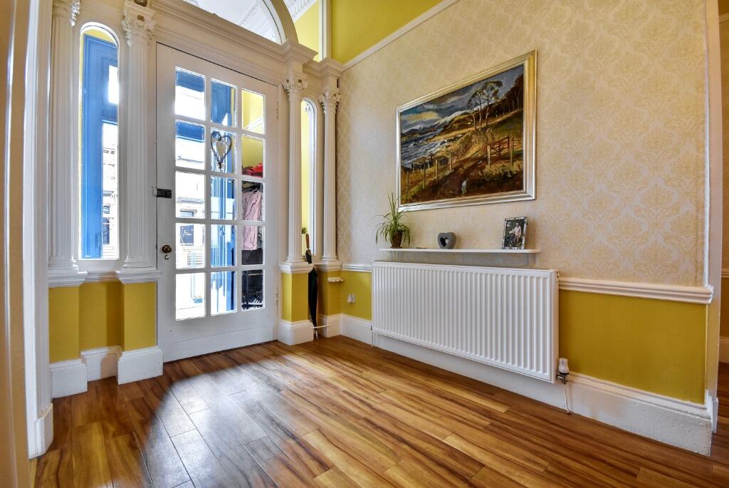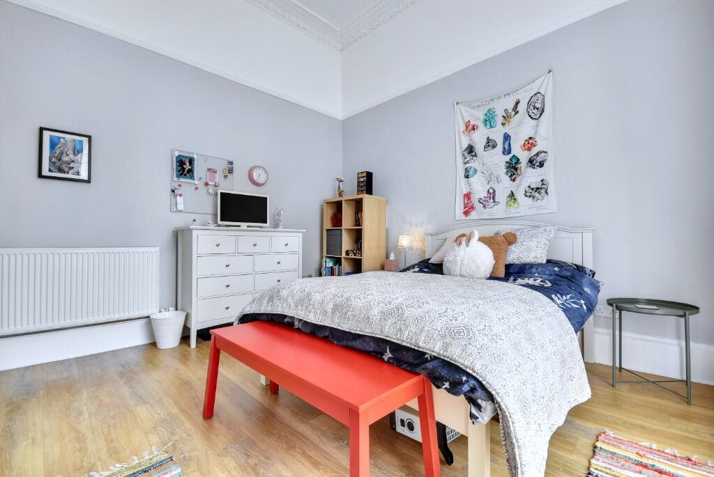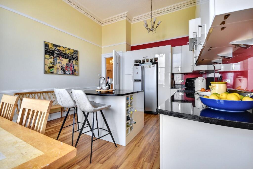 This property is a 4 bedroom, 2 bathroom flat located on Union Street, Inverclyde, Greenock. The property benefits from a large garden. Based on the images provided, the property appears to be a well-maintained period property. The interior boasts original features such as high ceilings, ornate cornicing, and large windows, which have been complemented by tasteful, modern updates to the kitchen and bathrooms. The property is presented in excellent condition. The location is a positive aspect of this property. While there is no specific information on proximity to schools, the presence of several nearby train stations suggests convenient access to public transportation. Given the average price of similar properties in the area is £157,388 and the average price per square foot is £160, the list price of £385,000 appears high. However, the unique character, excellent condition, and substantial garden of this period property could justify a premium price compared to average properties in the area. More information on the property’s square footage would be needed to provide a more precise analysis of value.