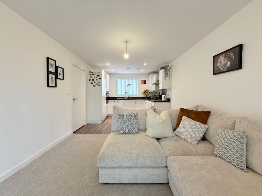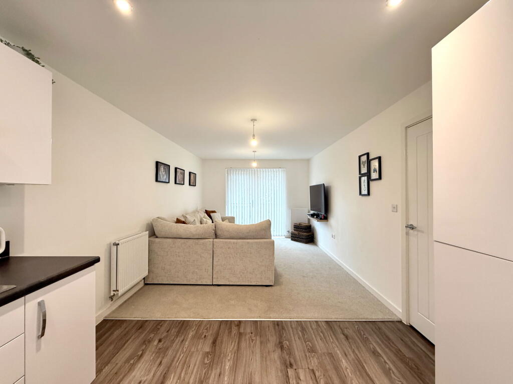 The property is a two-bedroom, two-bathroom apartment located in Newman Square, Shirley, Solihull. The apartment is modern and appears to be in excellent condition based on the provided photographs. The interior is well-presented and the fixtures and fittings look new. There is no garden associated with the property; however, there is a small balcony.