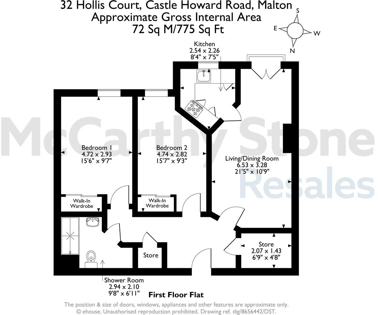 This is a two-bedroom apartment located in Hollis Court, Castle Howard Road, Malton. It is marketed by McCarthy & Stone Resales. The apartment offers 646.96 sqft of living space and includes a bathroom. The property benefits from communal gardens and parking. Malton is a market town with good transport links and local amenities. While the apartment is generally in good condition, some aspects of the decor could benefit from updating. The asking price of £230,000 seems reasonable considering the location and size of the property, but other apartments in the same complex are listed for less.