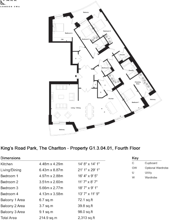 4 bedroom home on the 4th floor of The Charlton at King's Road Park. Luxuriously arranged living areas. Impressive principal bedroom arrangement.
