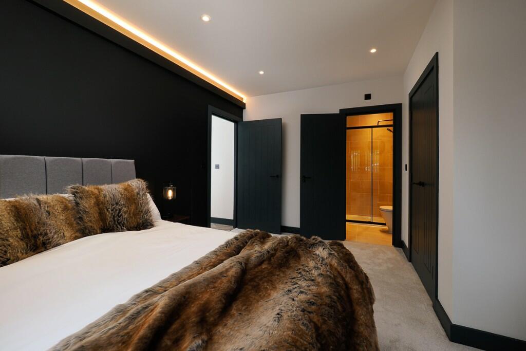 This property in Hawkinge, Kent, presents a modern and well-maintained apartment. The images reveal a contemporary design aesthetic with a focus on high-quality finishes and fixtures. The kitchen boasts sleek cabinetry and integrated appliances, while the bathroom features modern tiling and fittings. Bedrooms are presented in an equally stylish manner, with an emphasis on comfort and a cohesive design scheme.