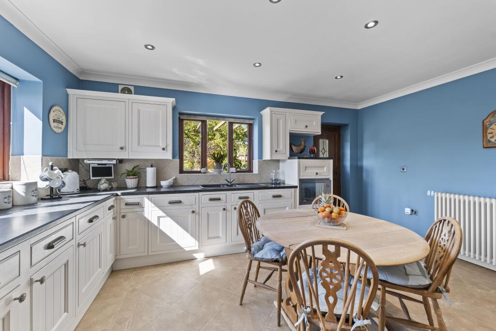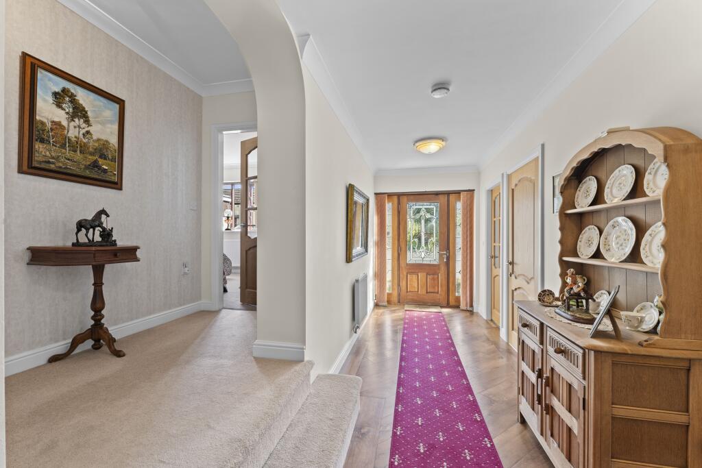 A very rare chance to buy a ready made equestrian facility with 12 stables, a large barn and a circa 12 acres field in such a great central location just minutes from local schools and amenities. The main property is a spacious and well presented three bedroom detached bungalow