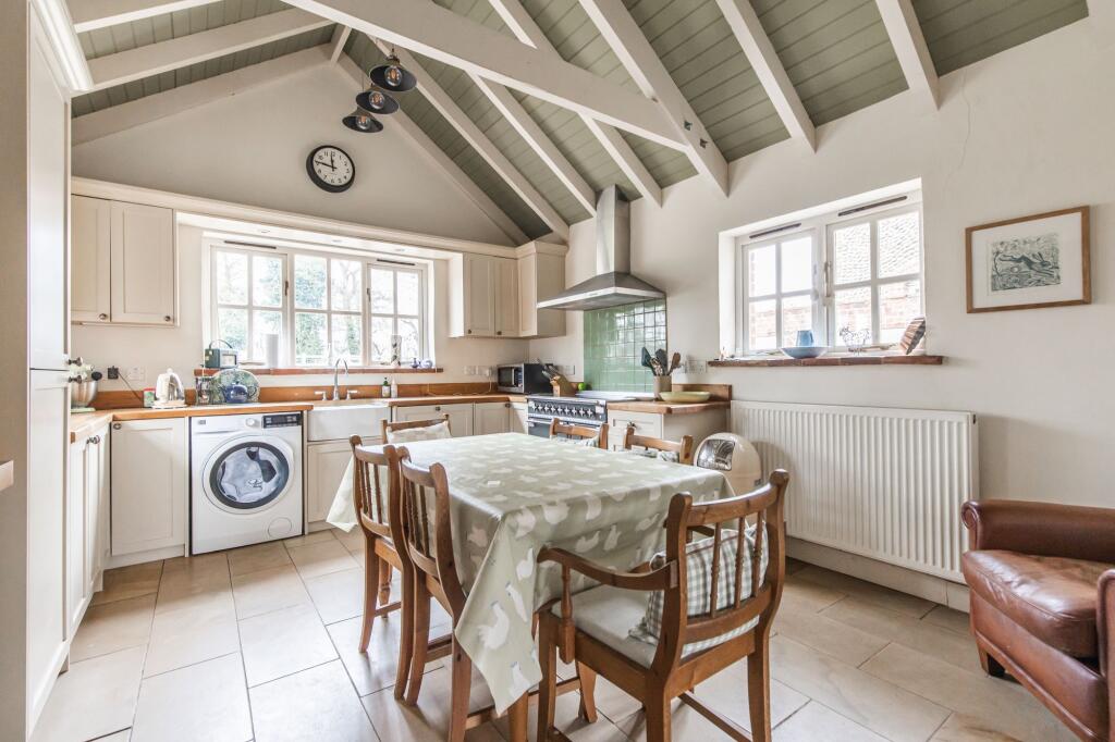 This property is a charming semi-detached house located in Hindringham, Norfolk. It benefits from a good-sized plot with a garden, and is within reasonable distance of a primary school rated as “Good” by Ofsted. The house itself appears to be in good condition, having undergone some modernisation whilst retaining traditional character. The exposed beams and brickwork add to its character. The kitchen is modern and well-equipped. While the average price per square foot in the area is £335, this property is listed at a price that is slightly above average, potentially reflecting its condition and desirable features. However, there is a lack of information regarding the exact plot size and square footage of nearby properties, making a definitive price comparison difficult.