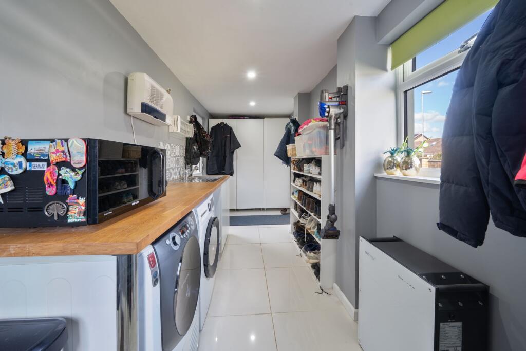 The entrance hall is eight metres wide and an impressive start to this immaculate family home, with attractive engineered oak flooring that continues throughout the majority of the ground floor, with stairs rising to the first floor and access to the ground floor WC with a modern suite and porcel...