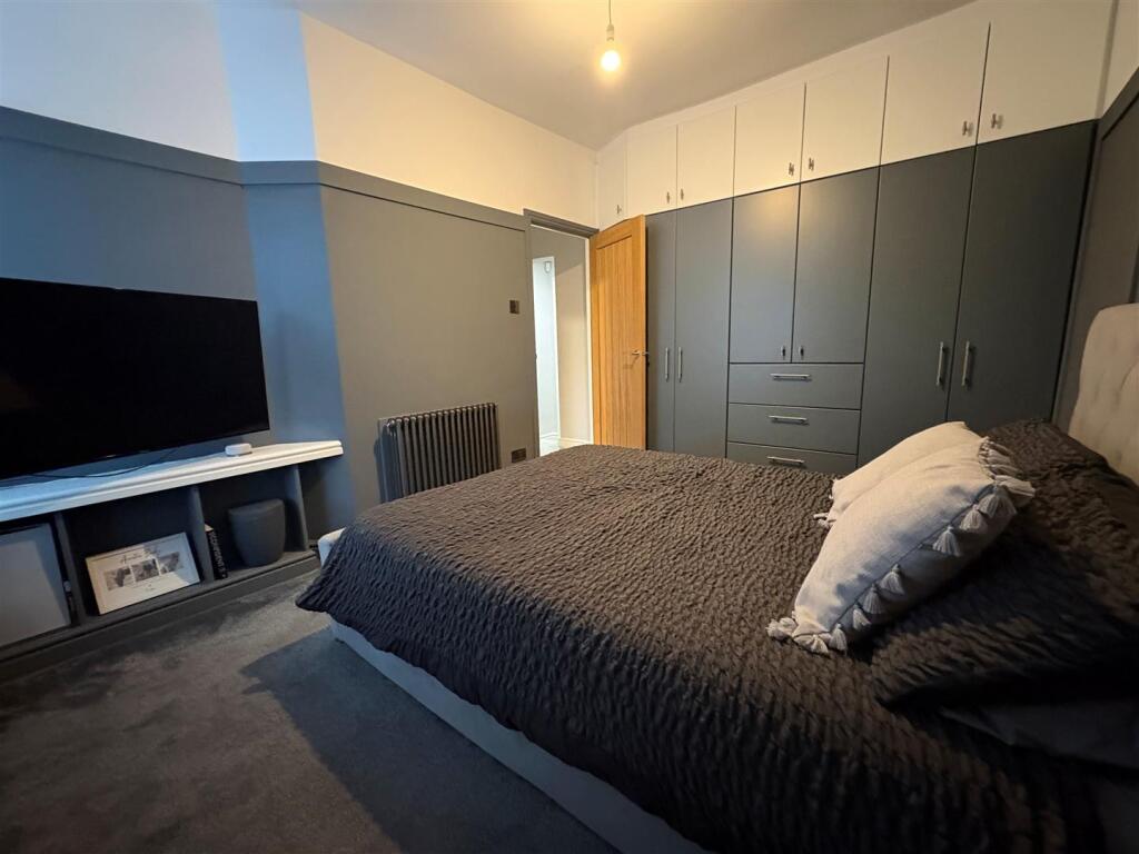 This is a two-bedroom terraced property located in Queensbury, Bradford. The property appears to be in good condition, with a modern kitchen and bathroom. The living areas and bedrooms are well-presented. The property has a small paved garden area to the rear. The property is located close to local schools and transportation links. The property is listed for £149,950, which seems reasonable given its condition and location.