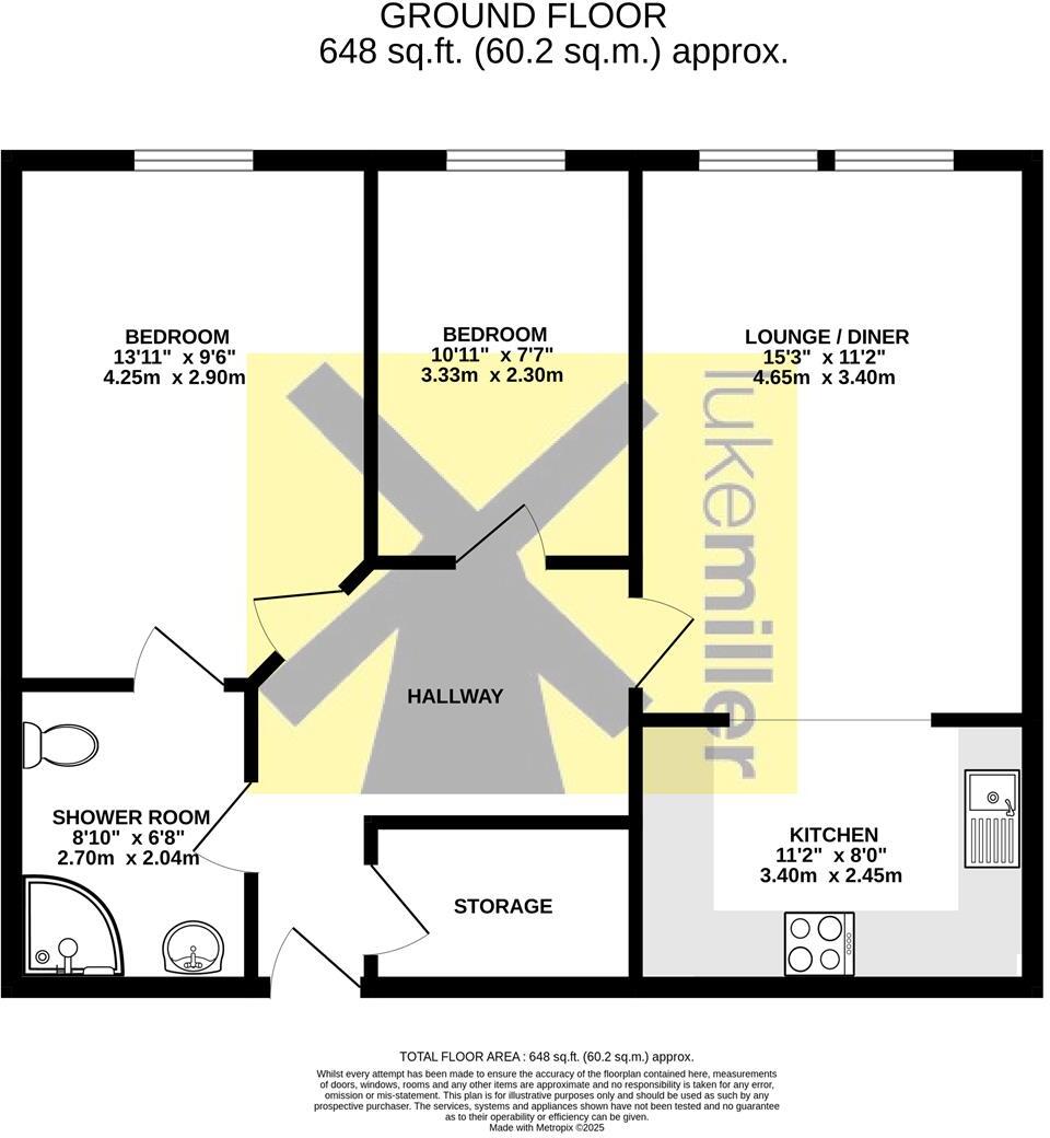 A two-bedroom second-floor apartment in the popular Meadowfields development with lift access. The layout includes a reception hall, lounge/diner, fitted kitchen, two bedrooms, and a modern wet room. Residents enjoy on-site amenities and a friendly community, with properties here seldom available.