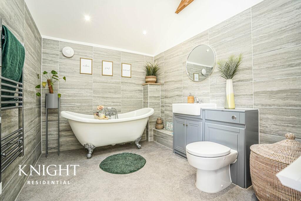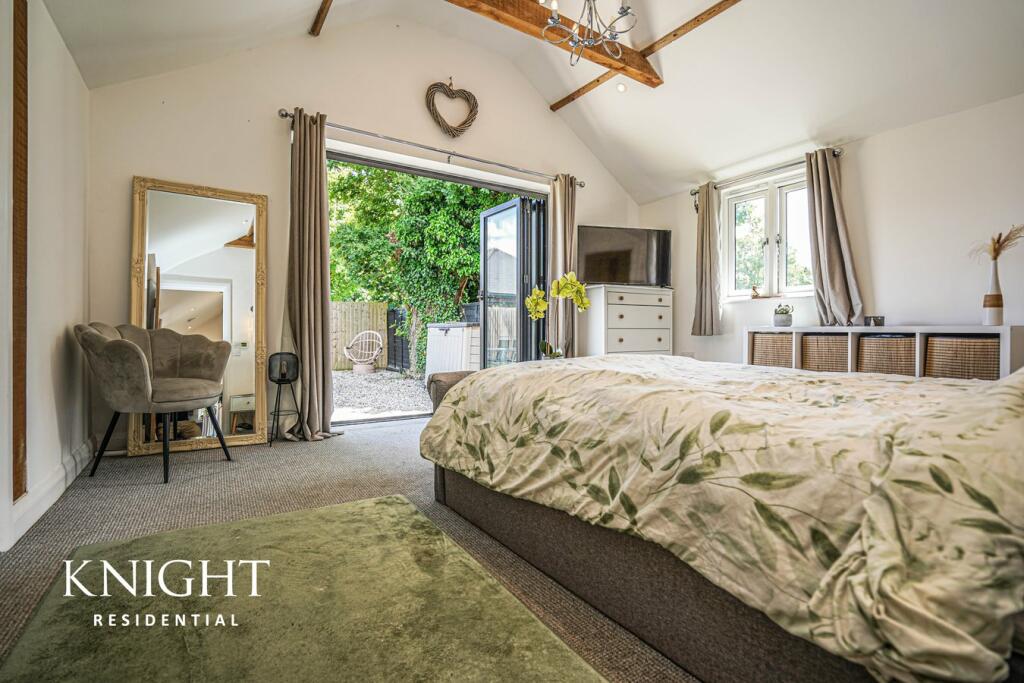 This property is a beautifully presented three-bedroom, two-bathroom house located in the sought-after village of Great Horkesley, Essex. The images reveal a modern and stylish interior with an open-plan living area, a contemporary kitchen, and well-appointed bedrooms and bathrooms. The property has clearly undergone recent renovations or conversion, resulting in a high-quality finish. The inclusion of a garden, although relatively small in size, provides outdoor space.